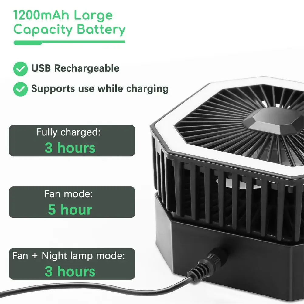 2. USB Charging: The fan has a built-in 1200mAh battery, compatible with all USB ports. Such as car charger, computer, power supply, AC adapter or any other USB outlet. The battery does not need to be replaced, which is more environmentally friendly and durable.