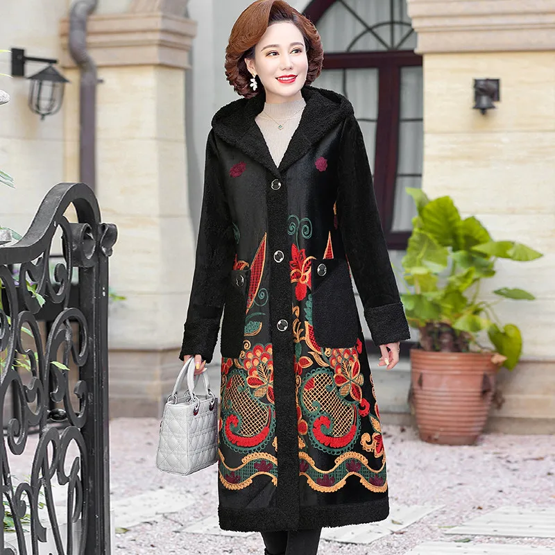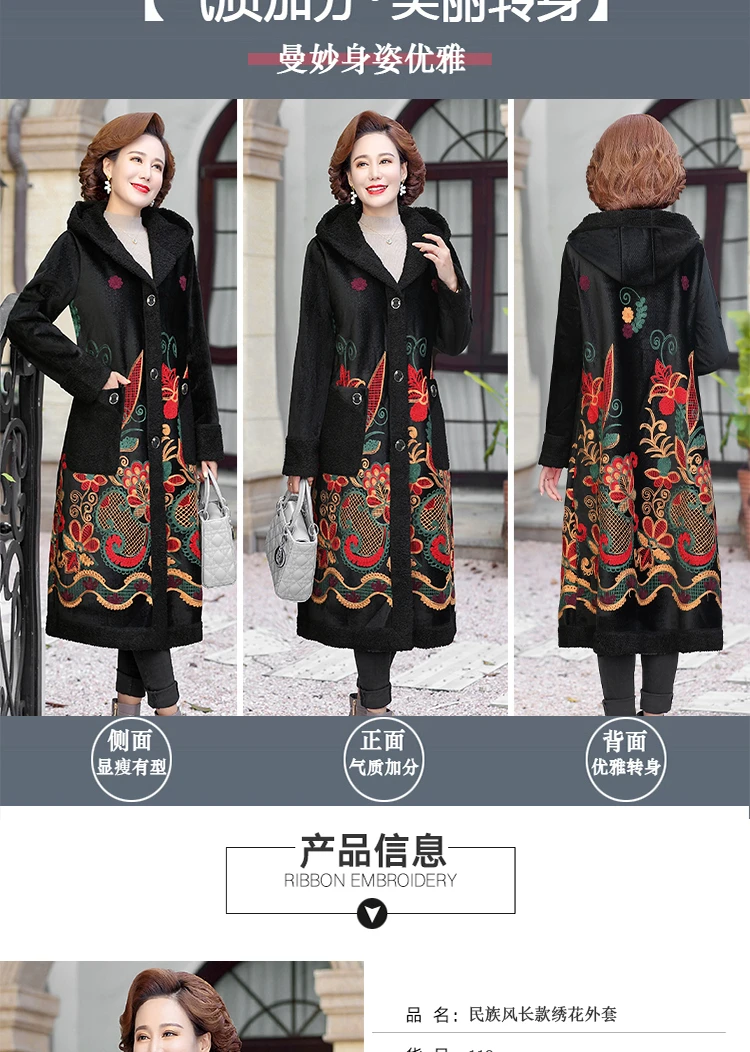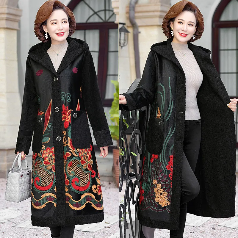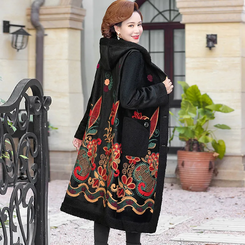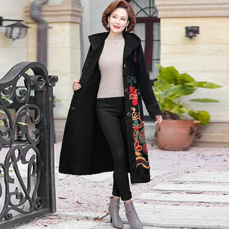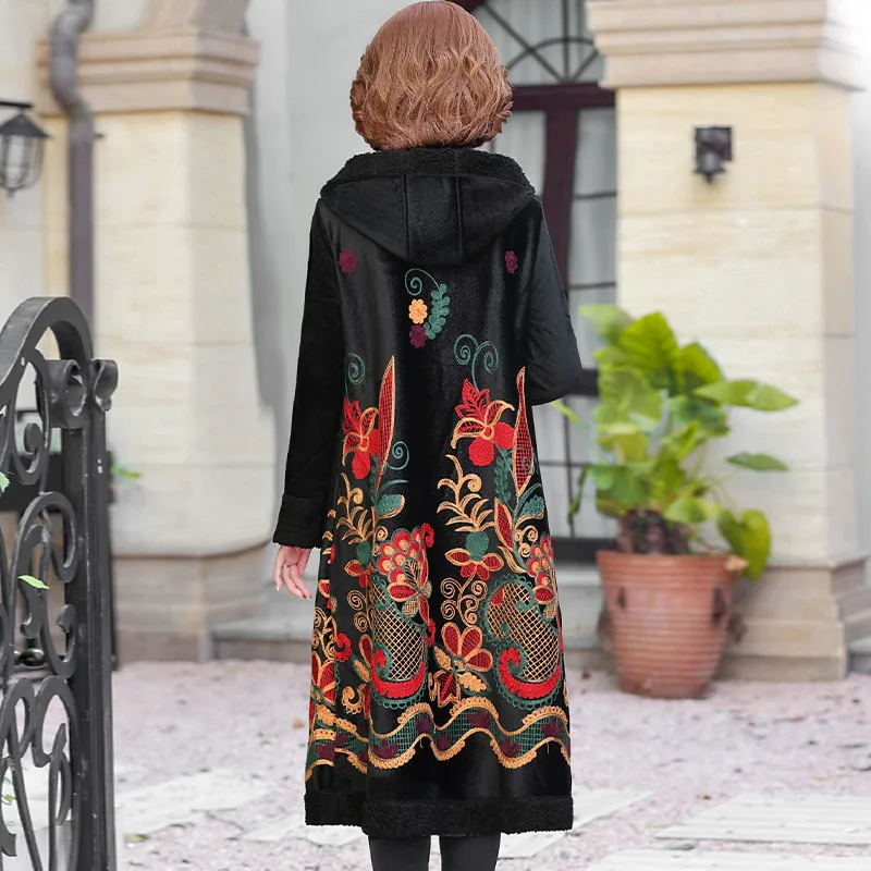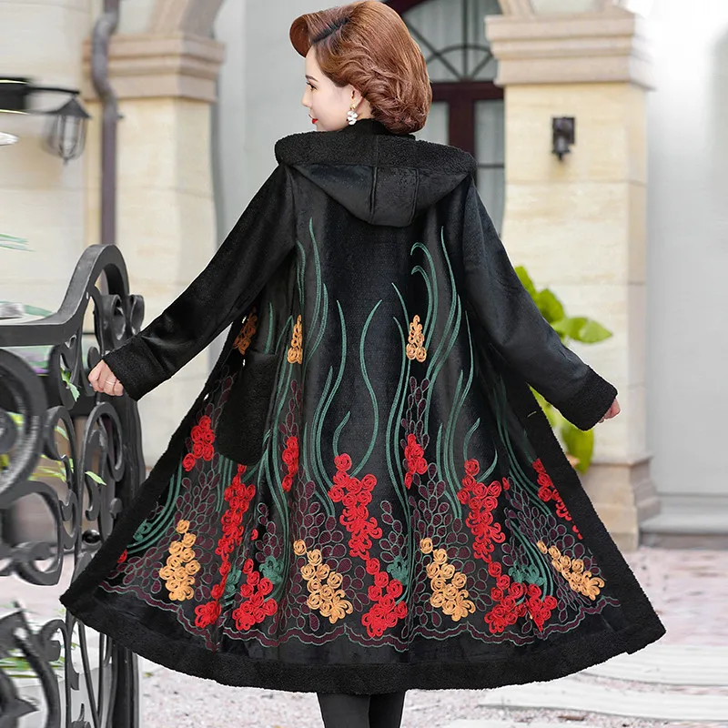 2021 Autumn winter women’s Embroidery flowers plush velvet Thick Long Jacket Overcoat Female retro hooded Warm Trench Coats