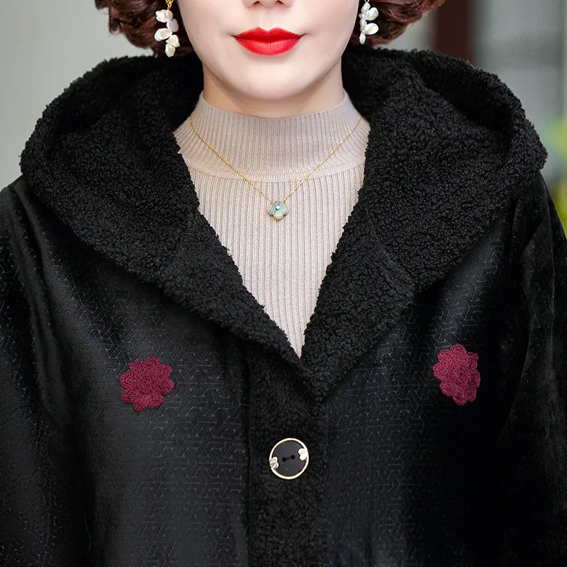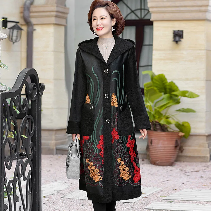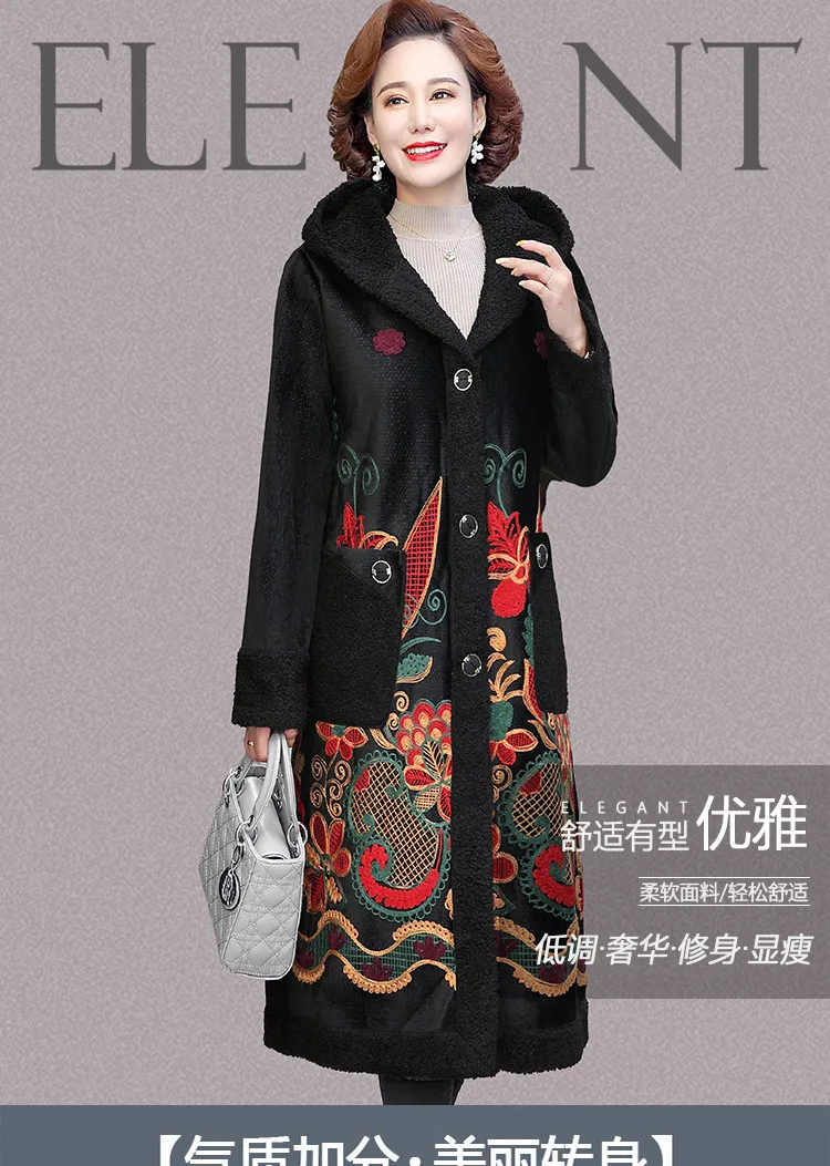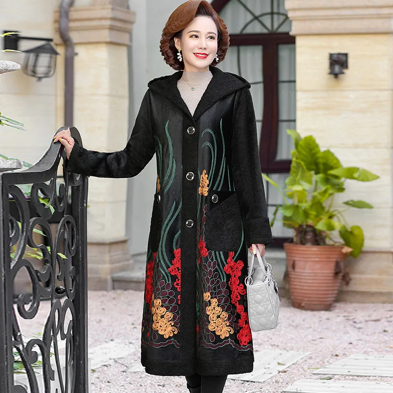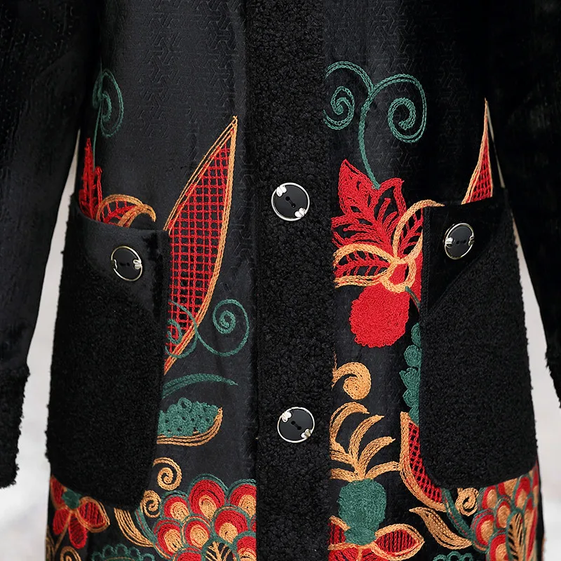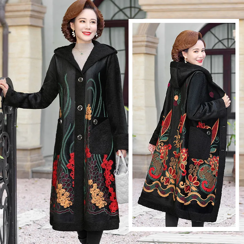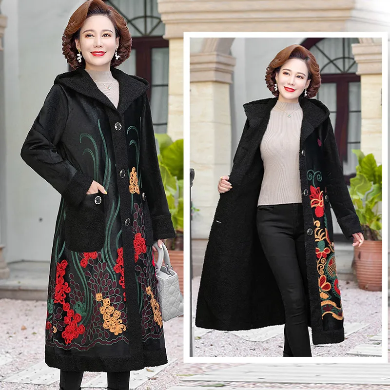 2021 Autumn winter women’s Embroidery flowers plush velvet Thick Long Jacket Overcoat Female retro hooded Warm Trench Coats