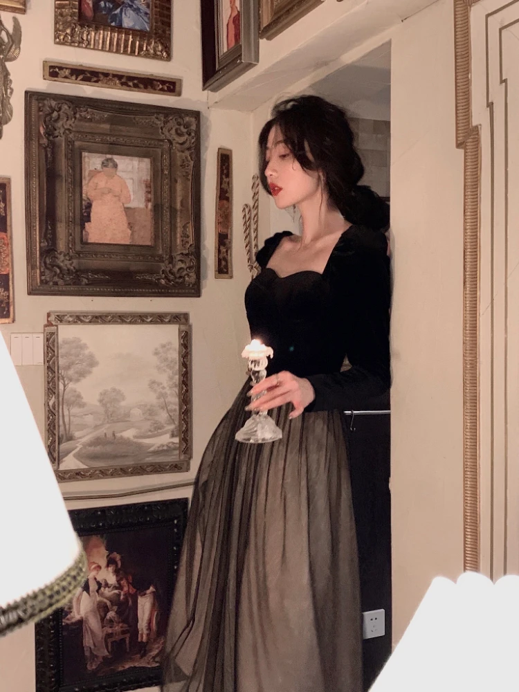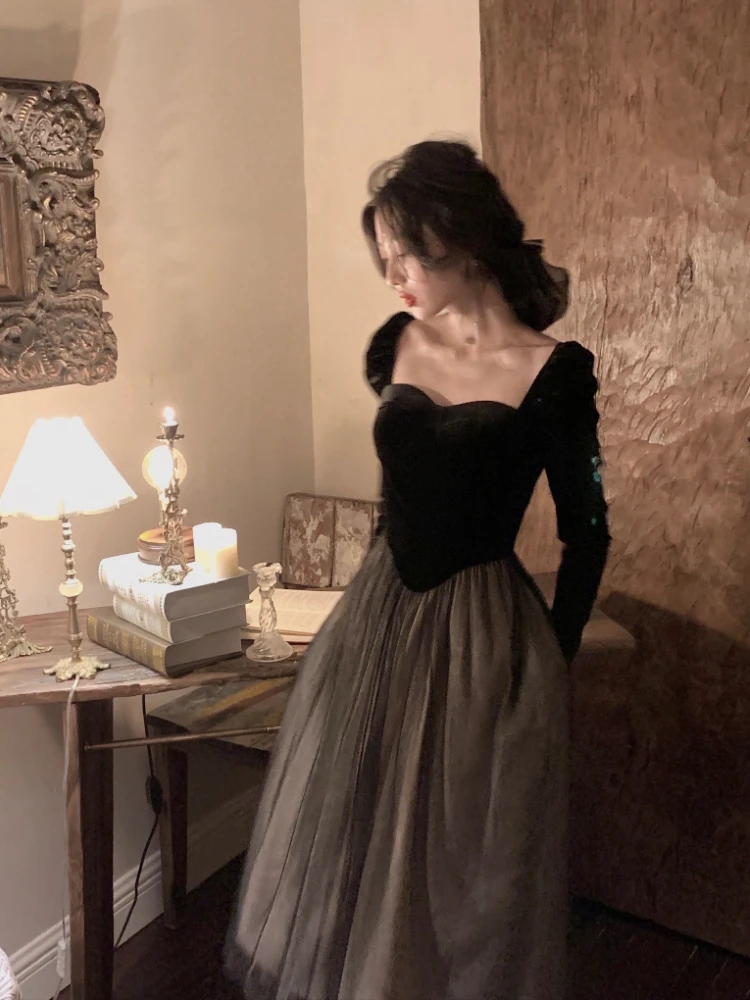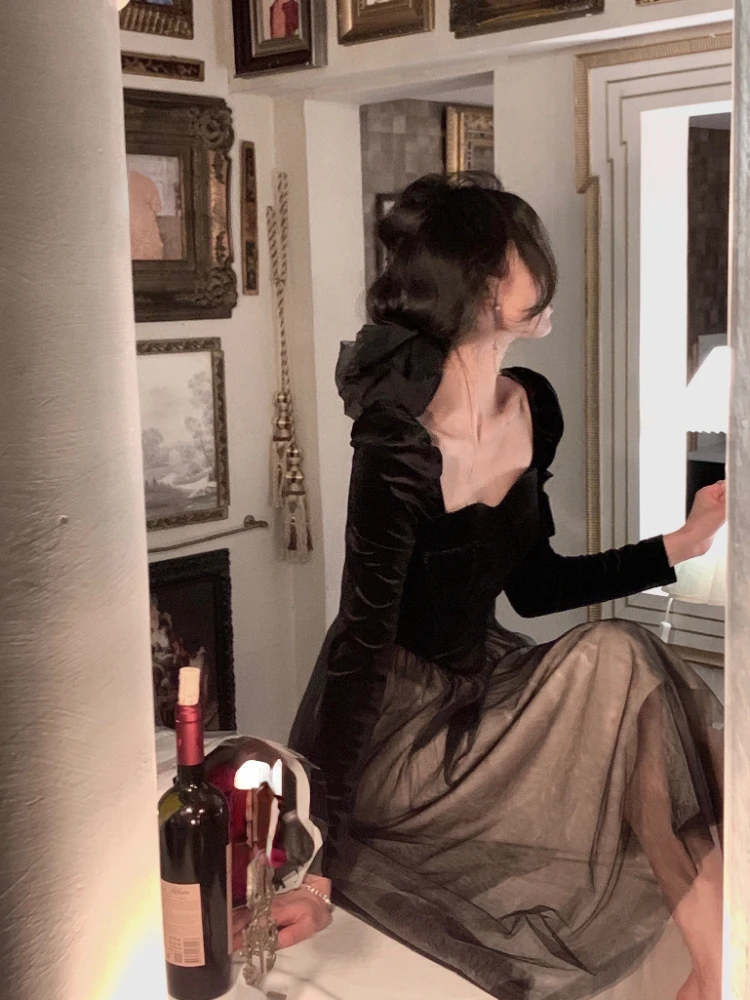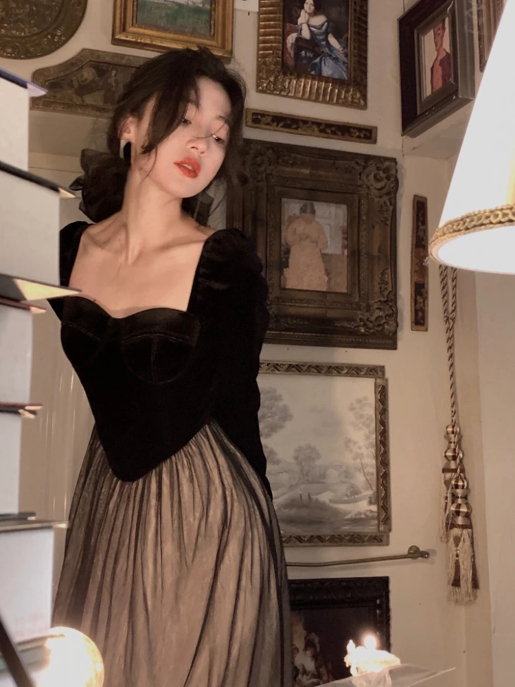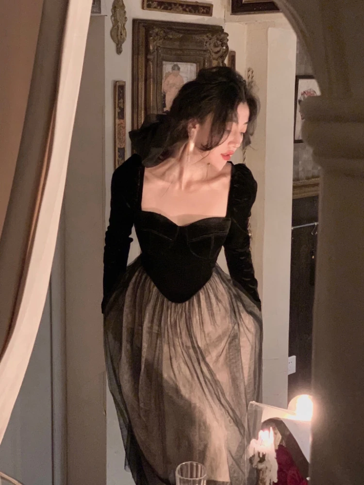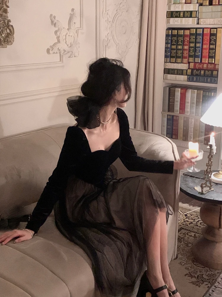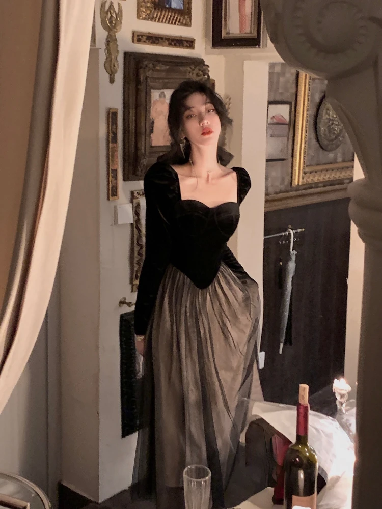 2022 Autumn Elegant Velvet Long Sleeve Midi Dress Woman Slim Vintage Evening Party Dress Female Casual Korean Fashion Dress Chic