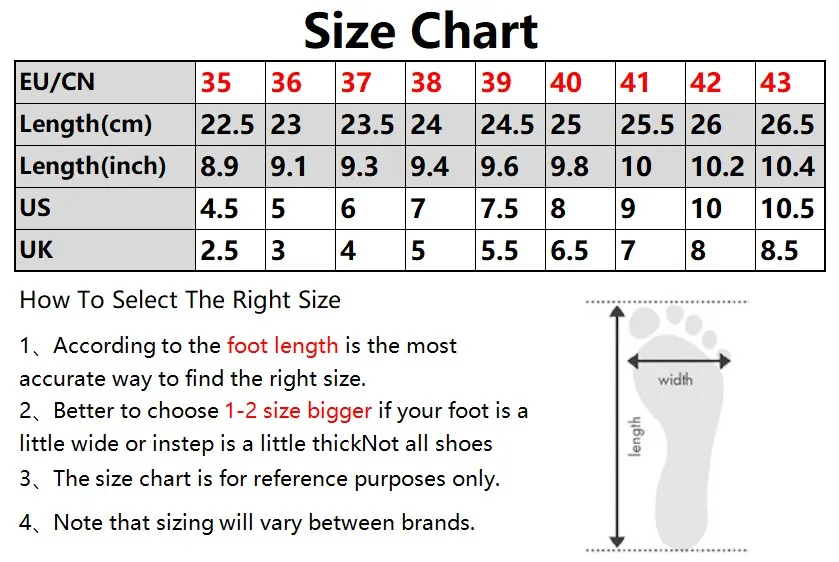 1.Choose the size according to your foot length (Don’t choose size according to your country usual size !!!)