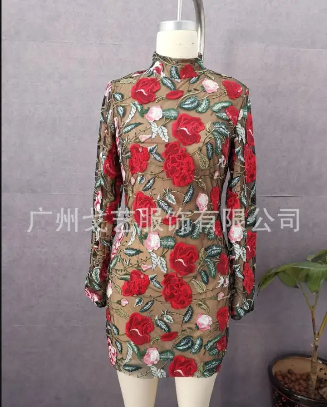 2023 New Embroidery Applique Fashion Women Party Dress Nightclub Holidays See Through Mesh Long Sleeves Sexy Dresses