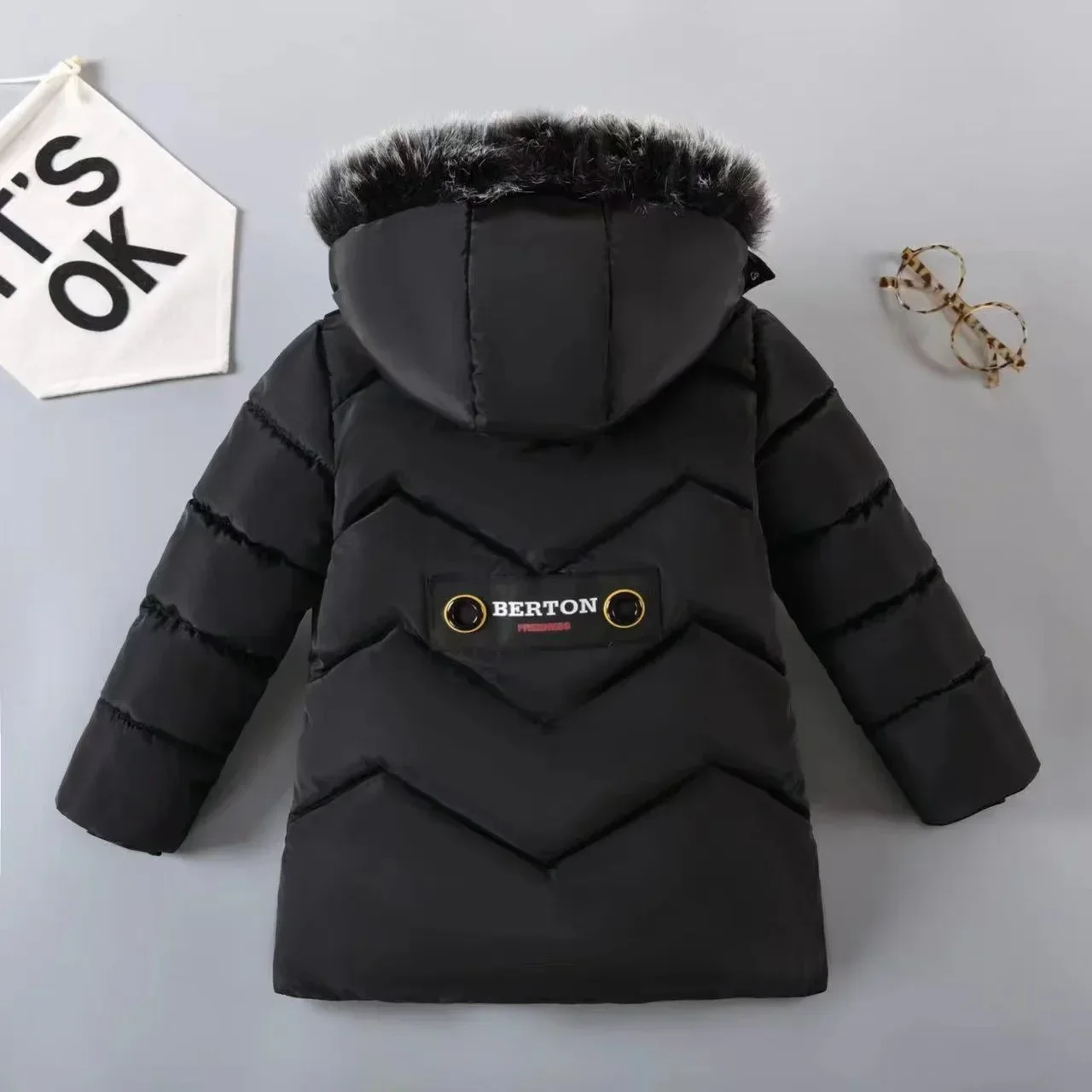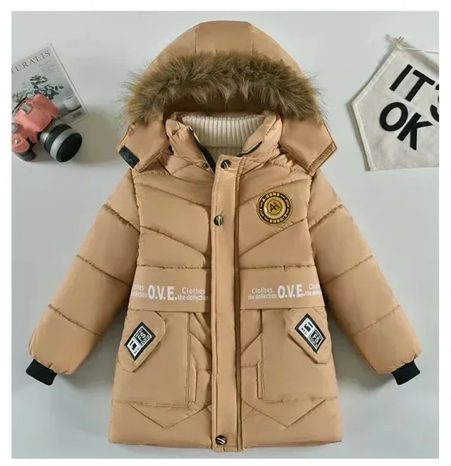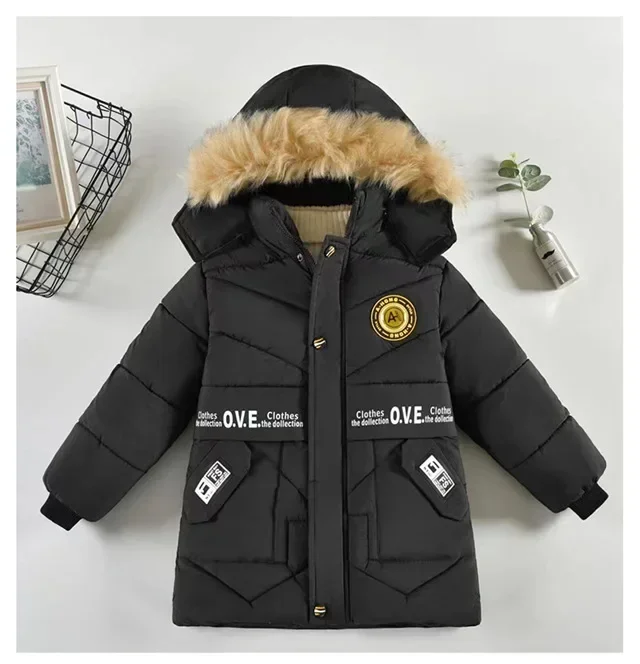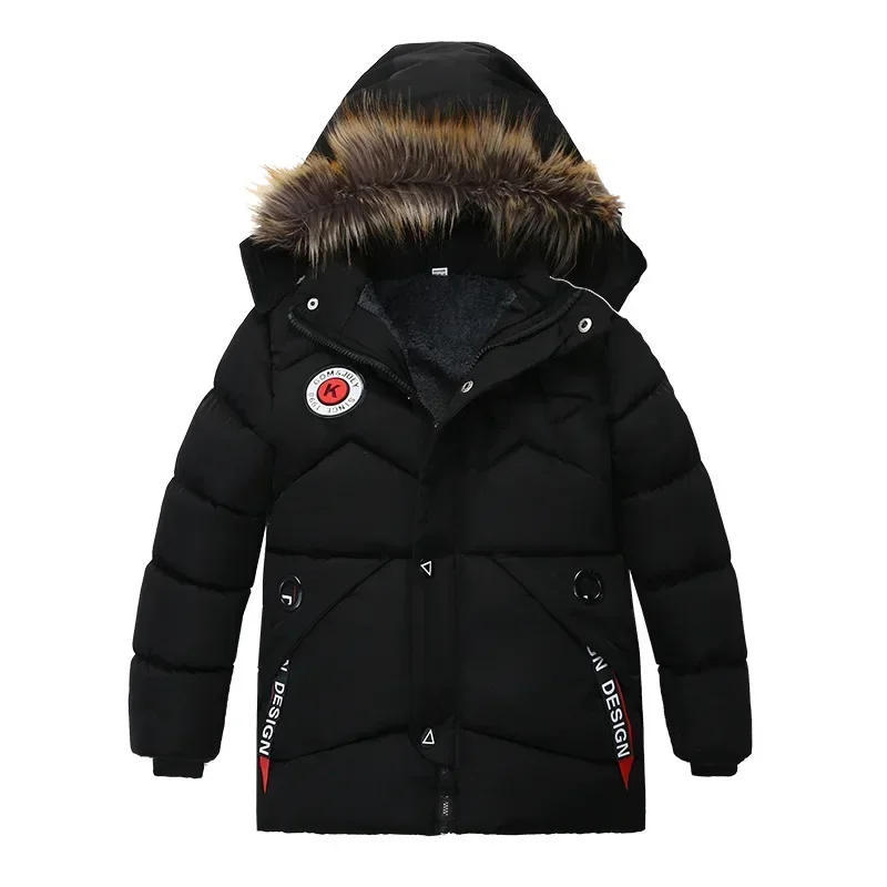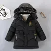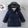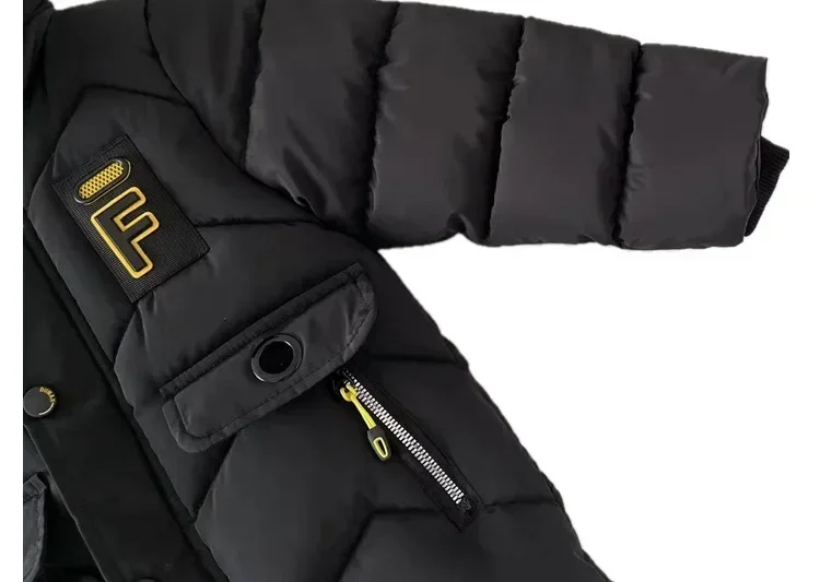 2023 New Style Winter Keep Warm Boys Jacket Letter F Fashion Lining With Plush Fur Collar Hooded Heavy Coat For Kids