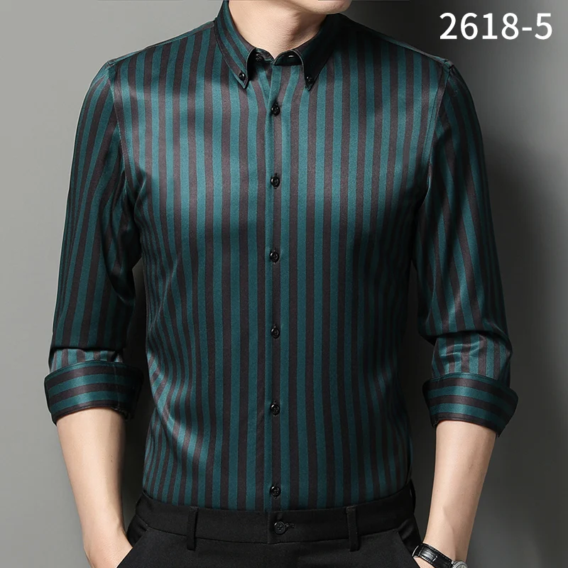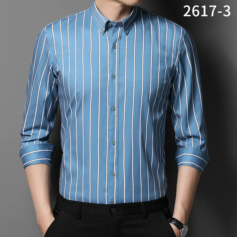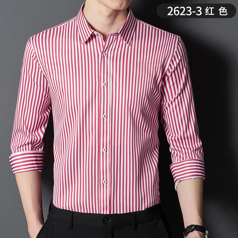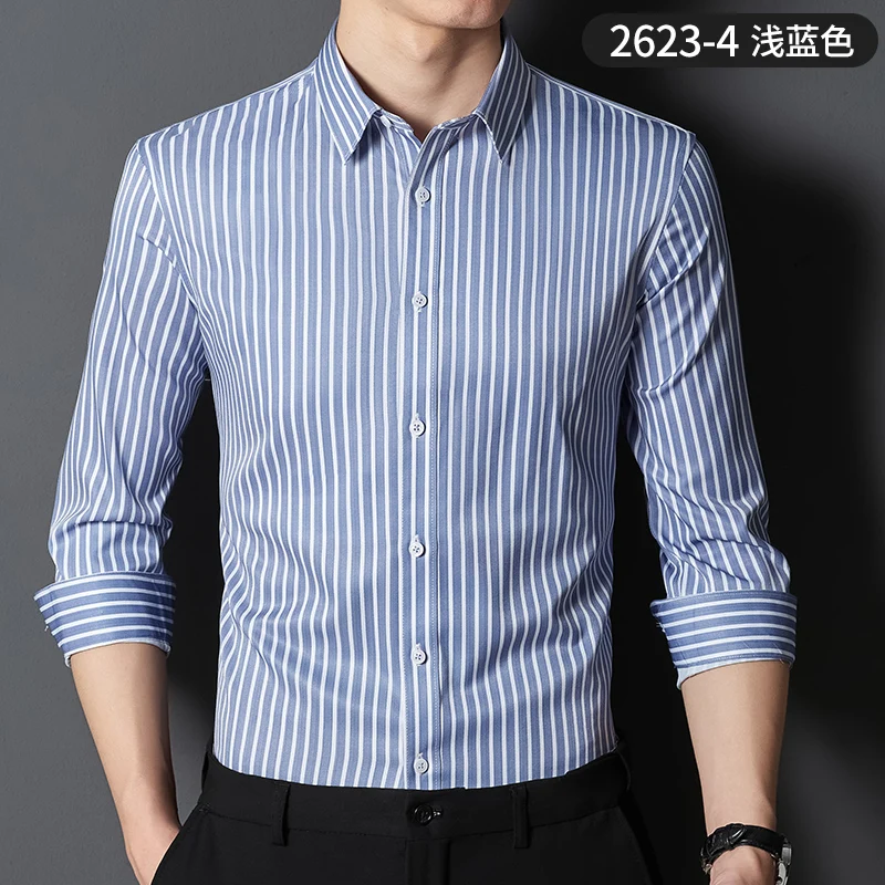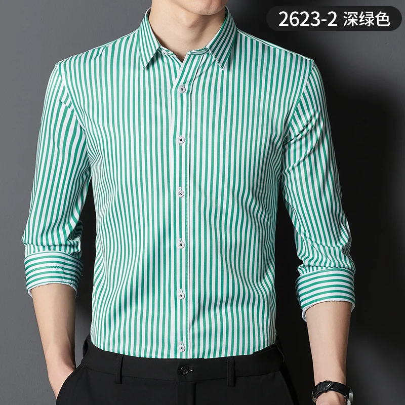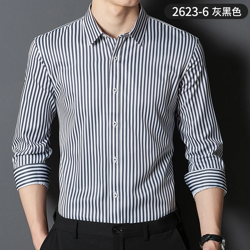 2023 Top Quality No Ironing Stretch Men Dress Shirt Long Sleeve No Trace Soft Cozy Pocket-less Formal Regular Fit Striped Shirt