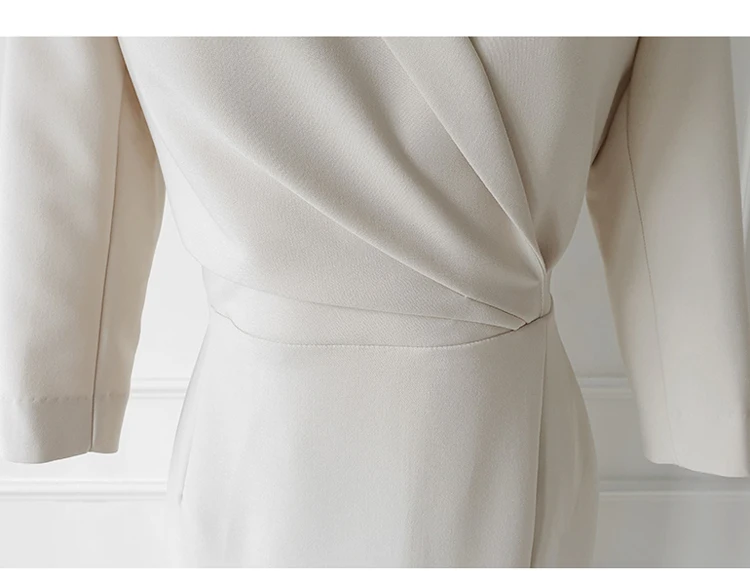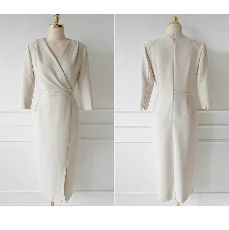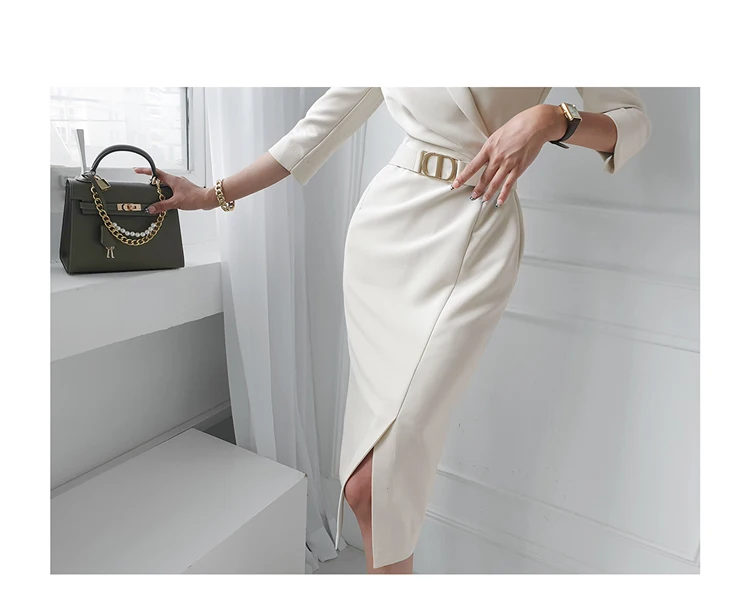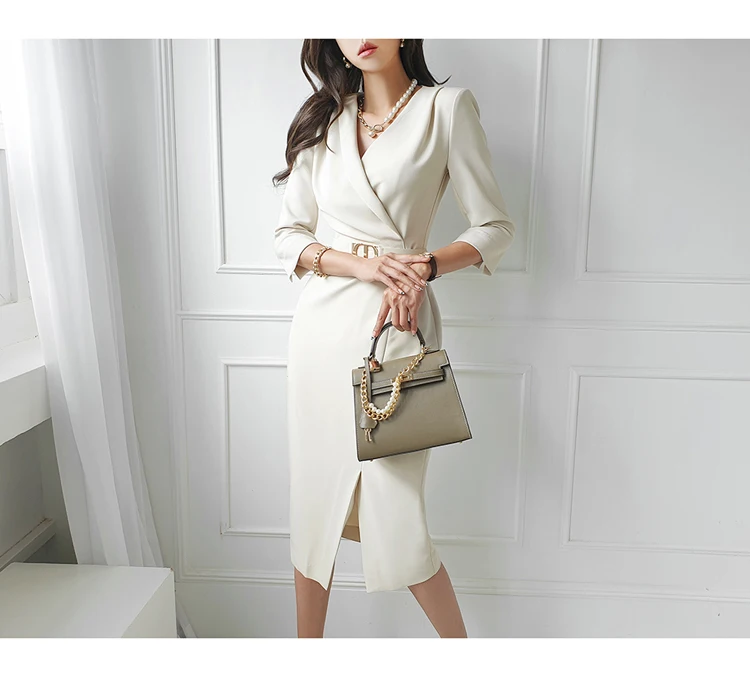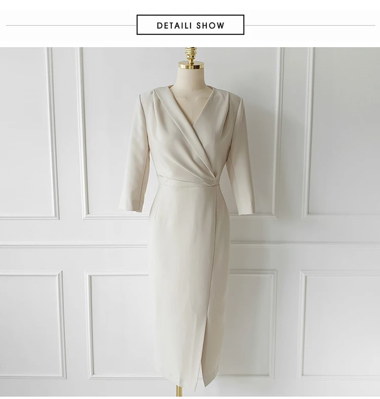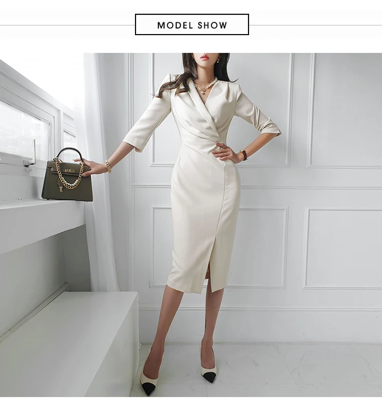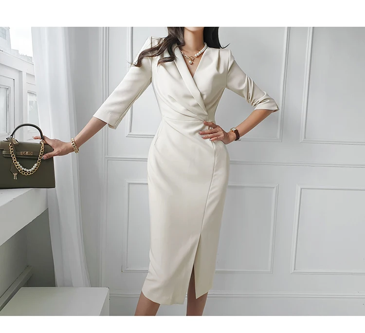 2024 Autumn New Korean Version Temperament V Neck Slim Mid-Length Dresses Women’s Slit Fashion Professional Dresses Vestidos