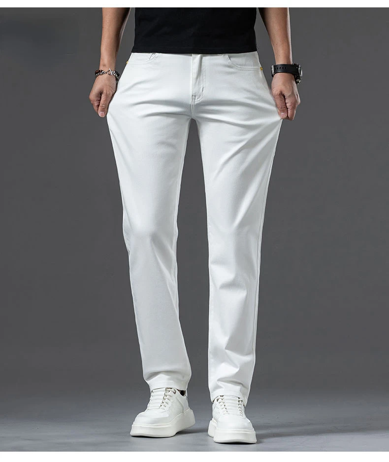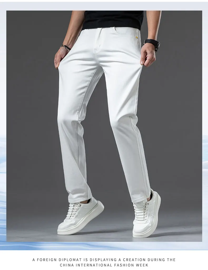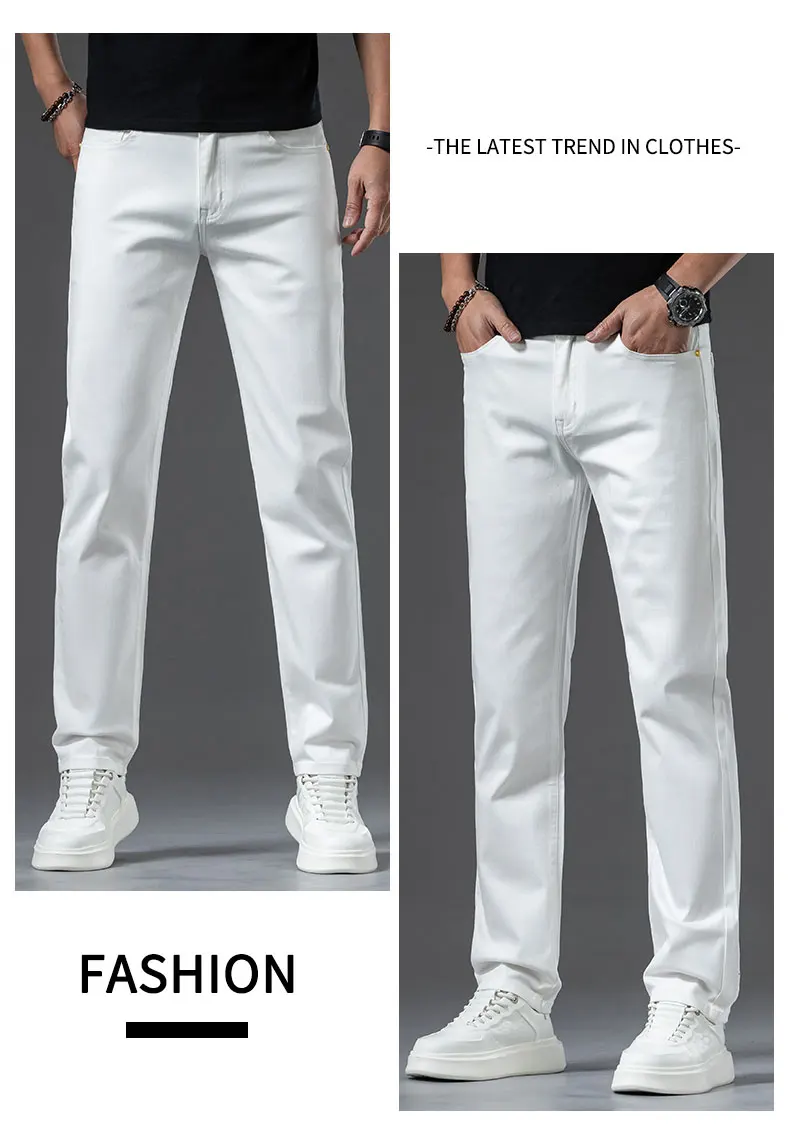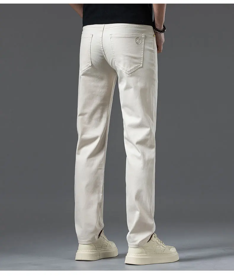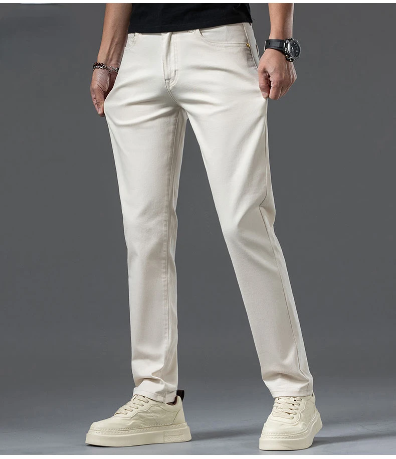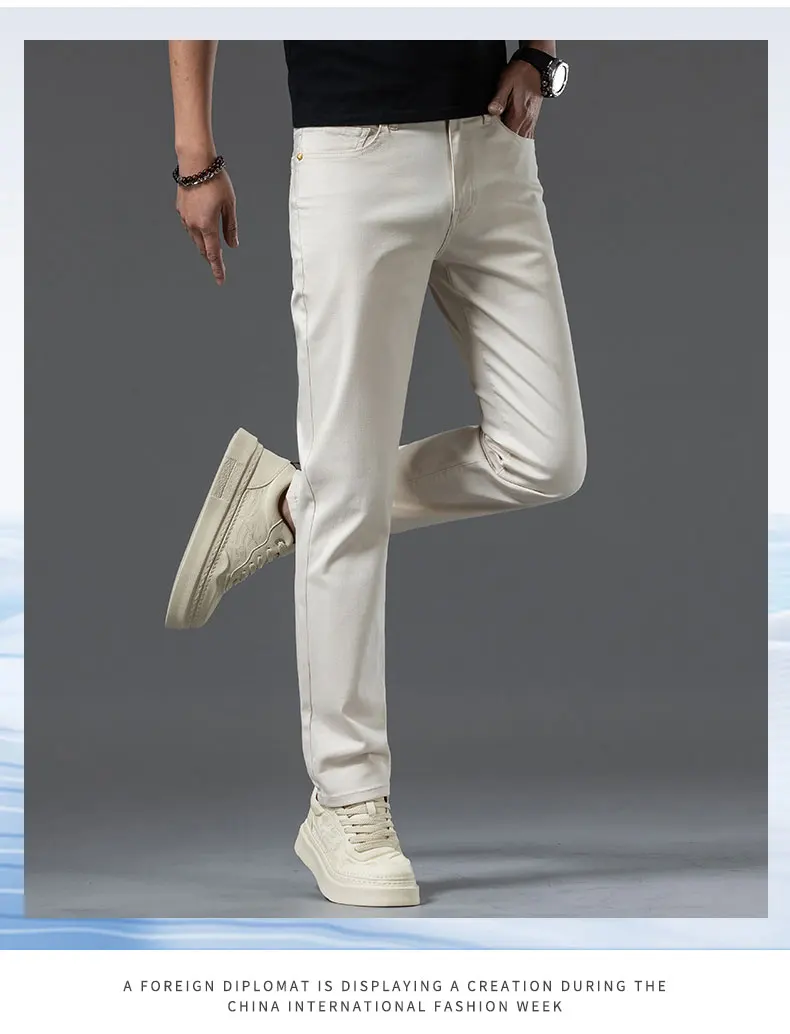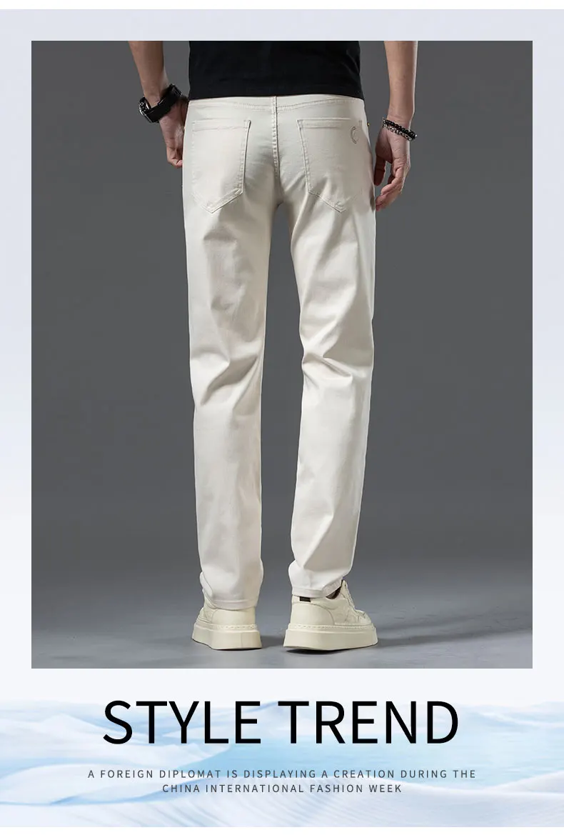 2024 New Men’s Khaki White Cotton Stretch Slim Smart Jeans Casual Straight Business Fashion Beige Brand Denim Trousers
