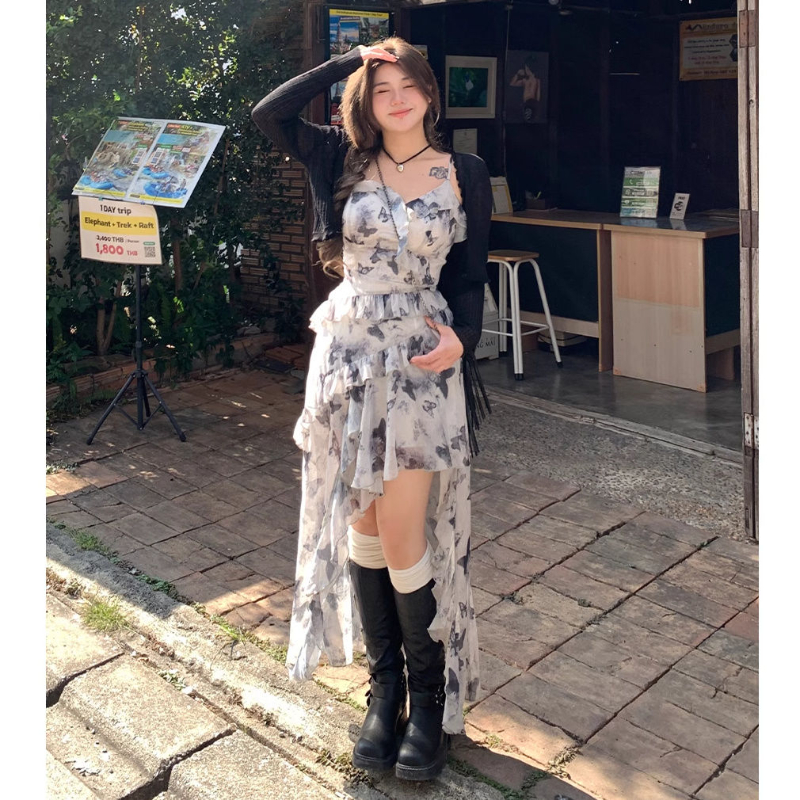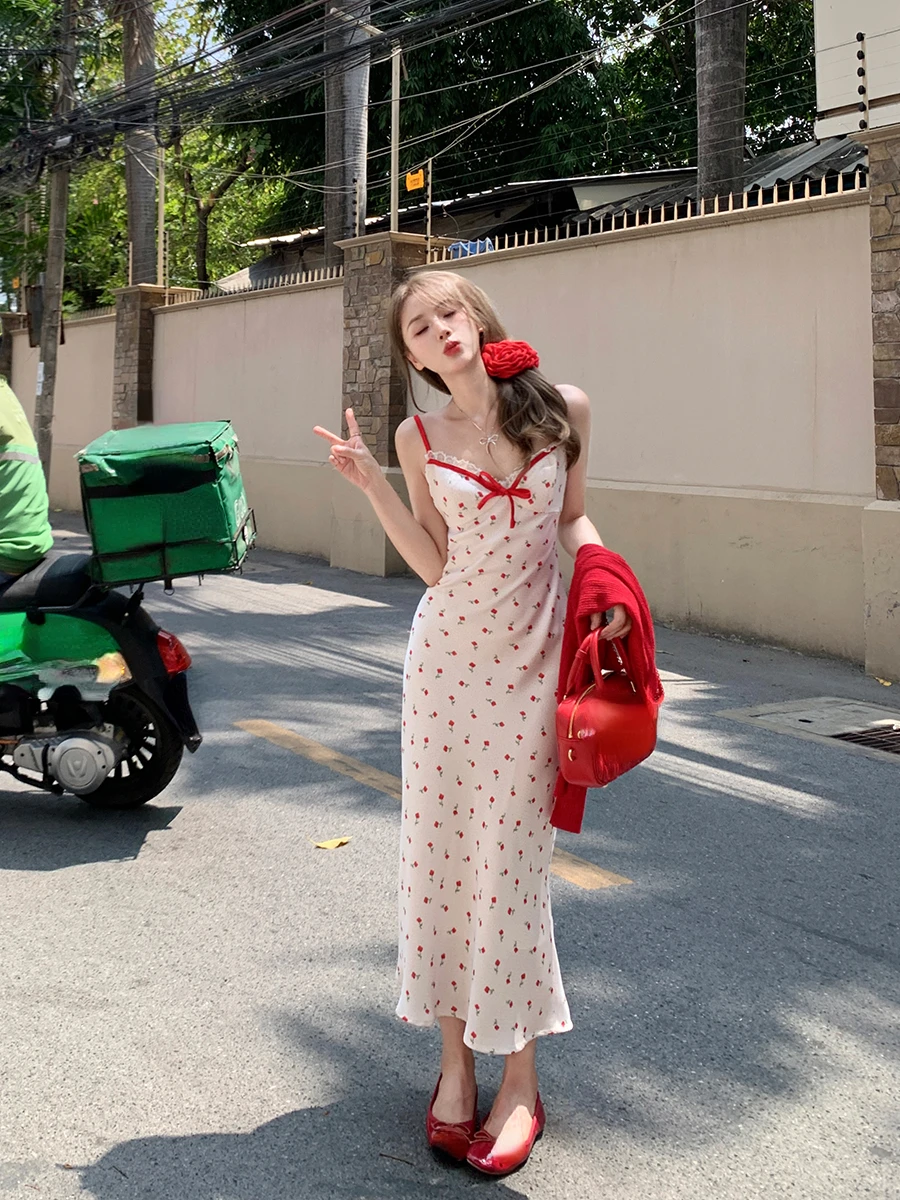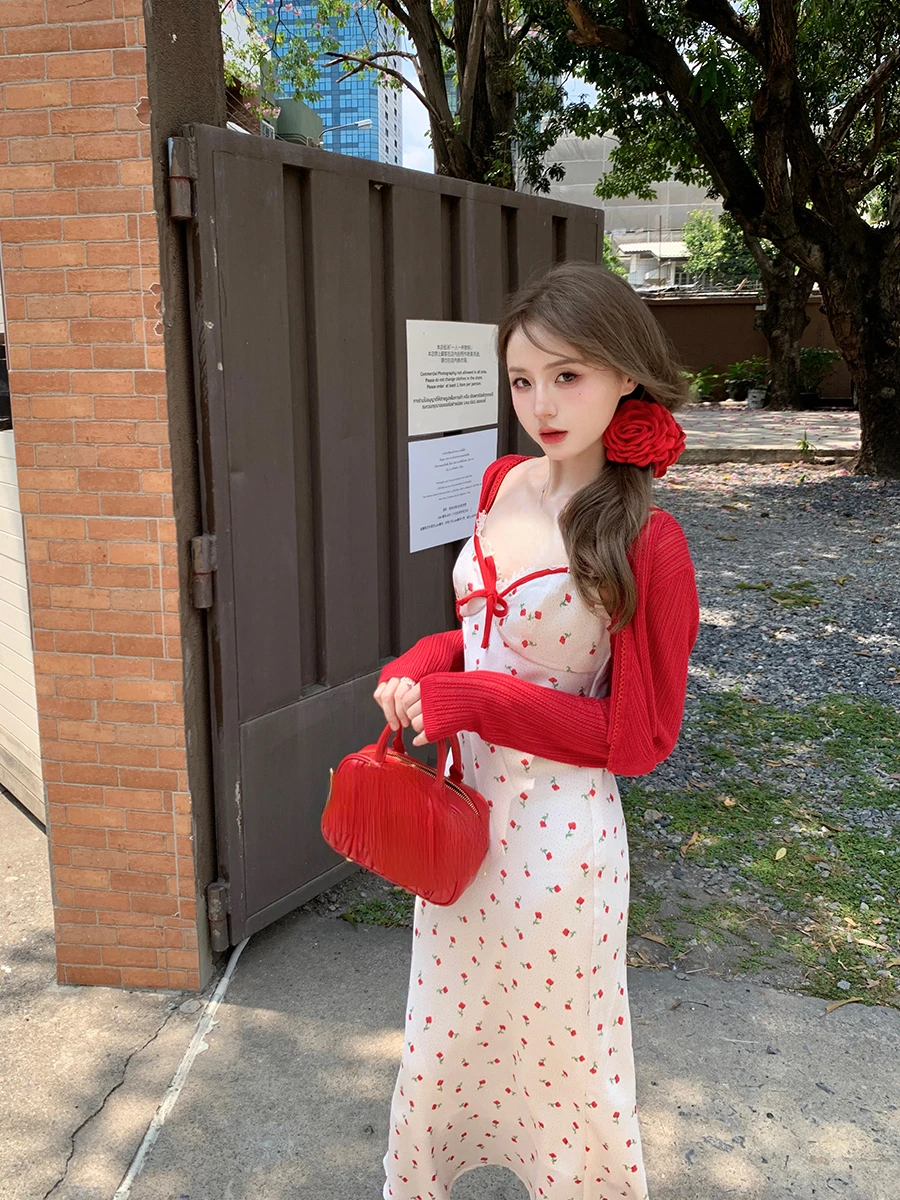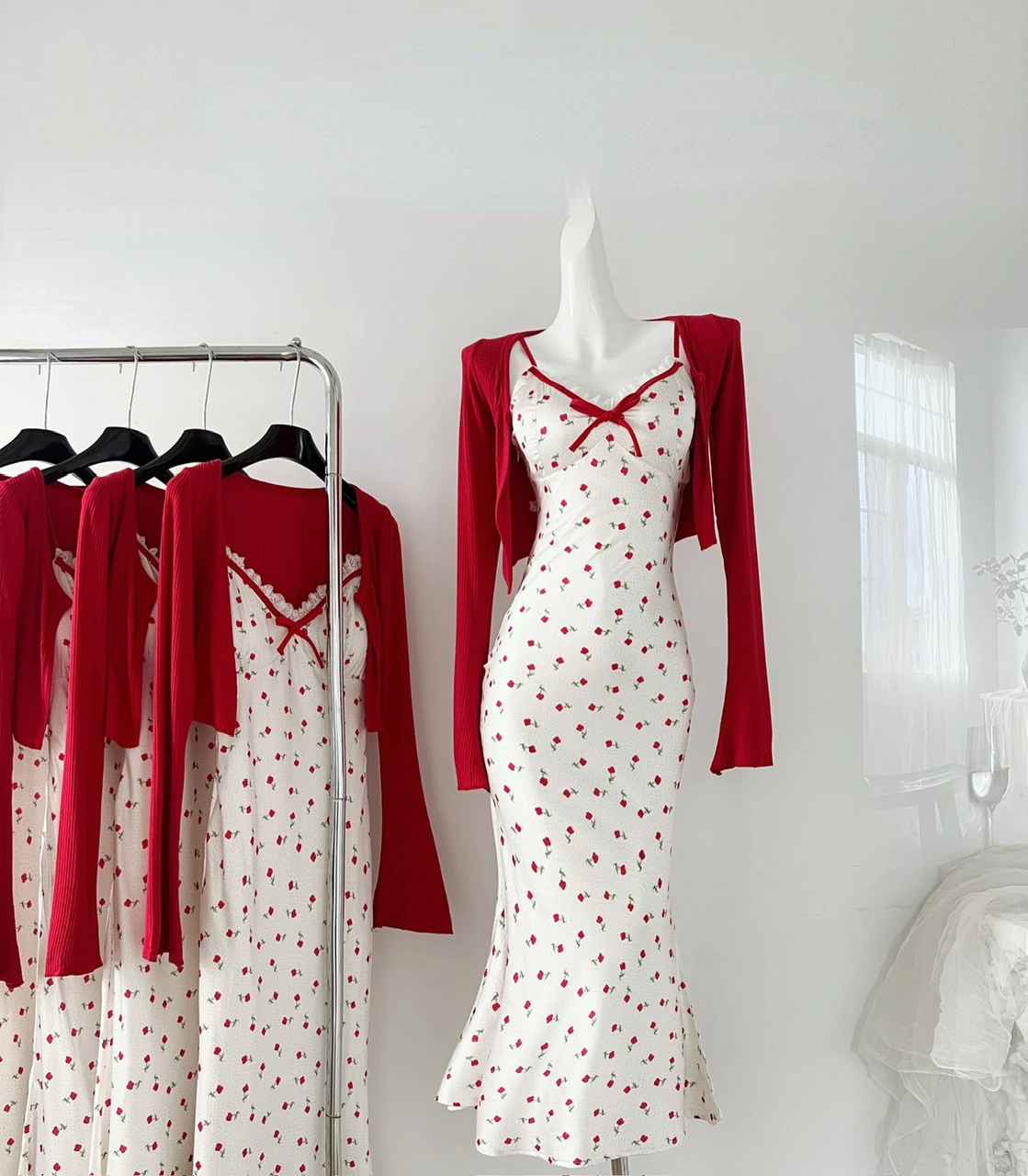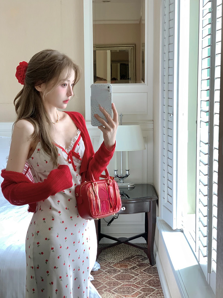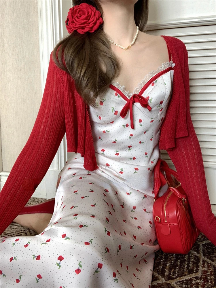 2024 New Sweet Sexy 2 Piece Dress Set Wonan Red Short Cardigan Print Sleeveless Midi Dress Party Korean Fashion Suit Female