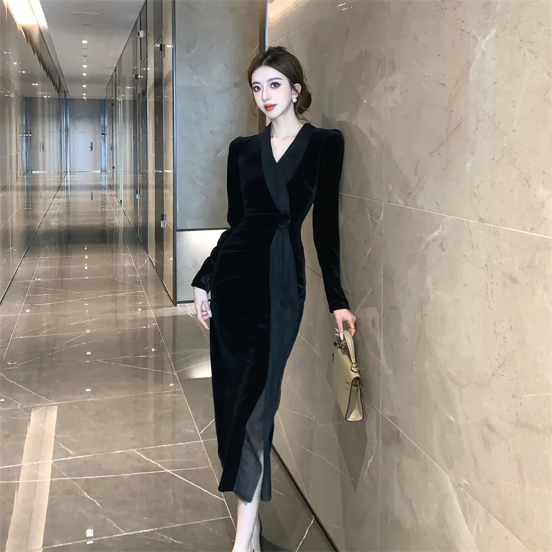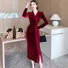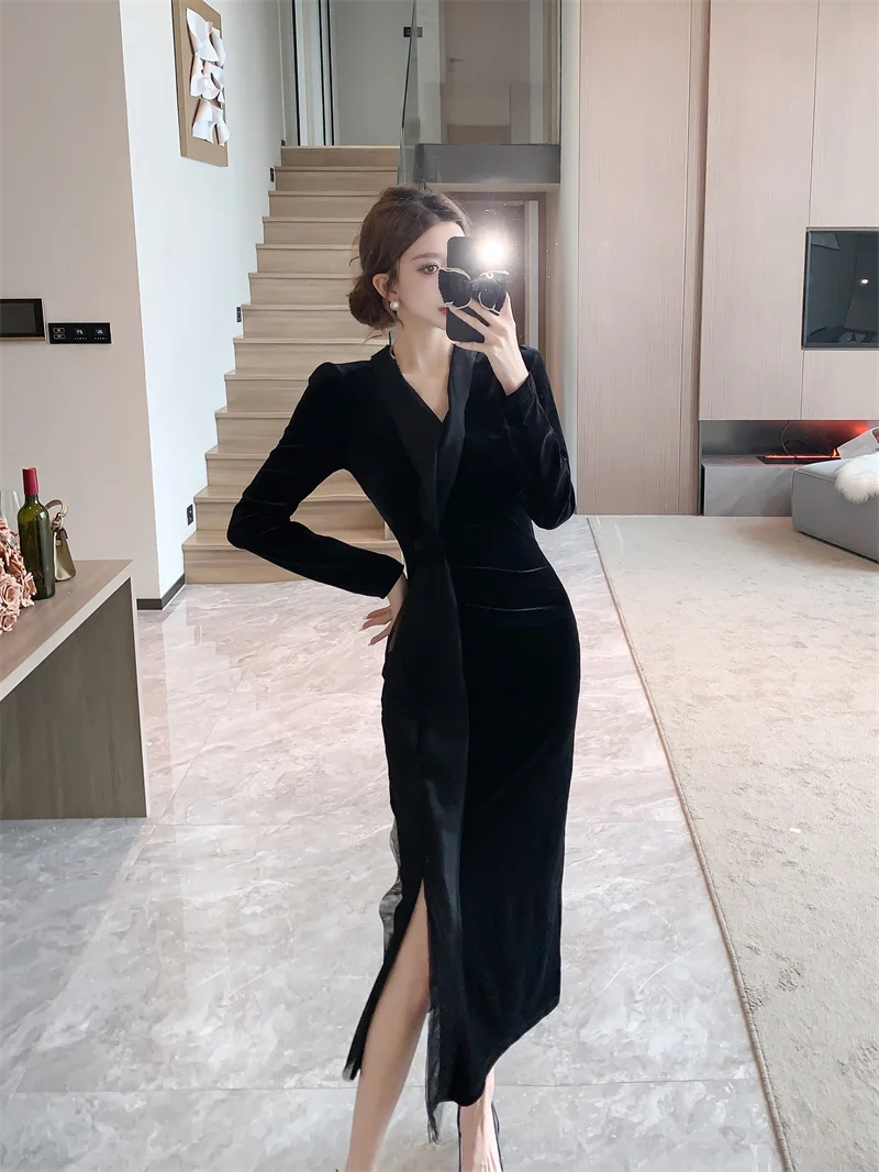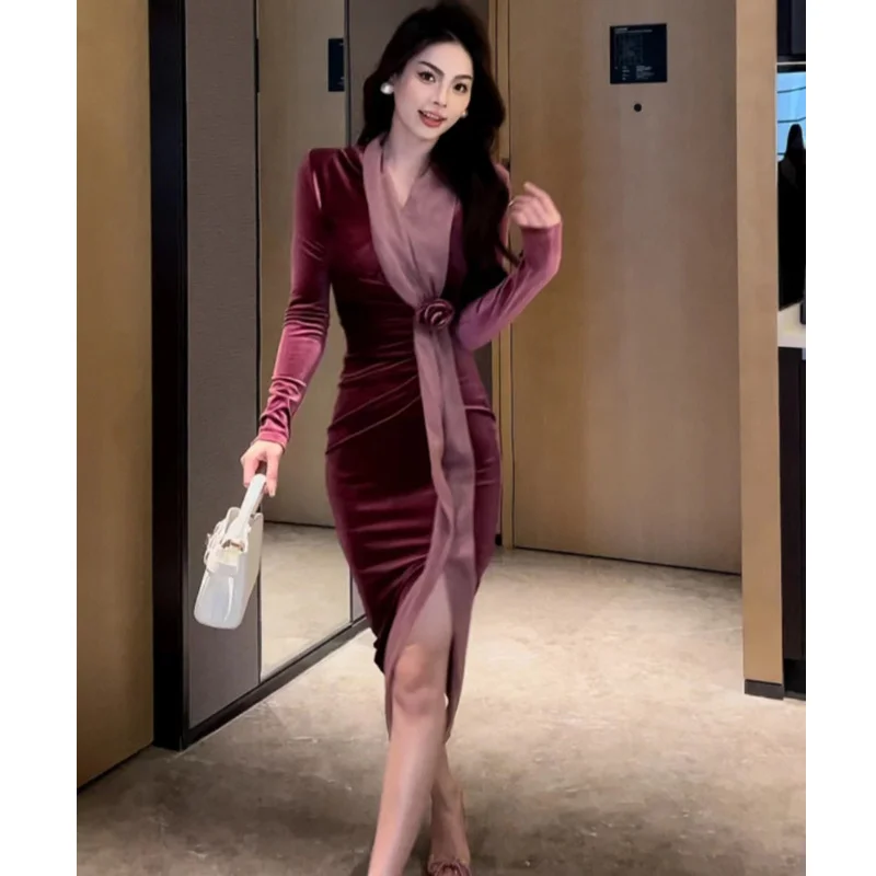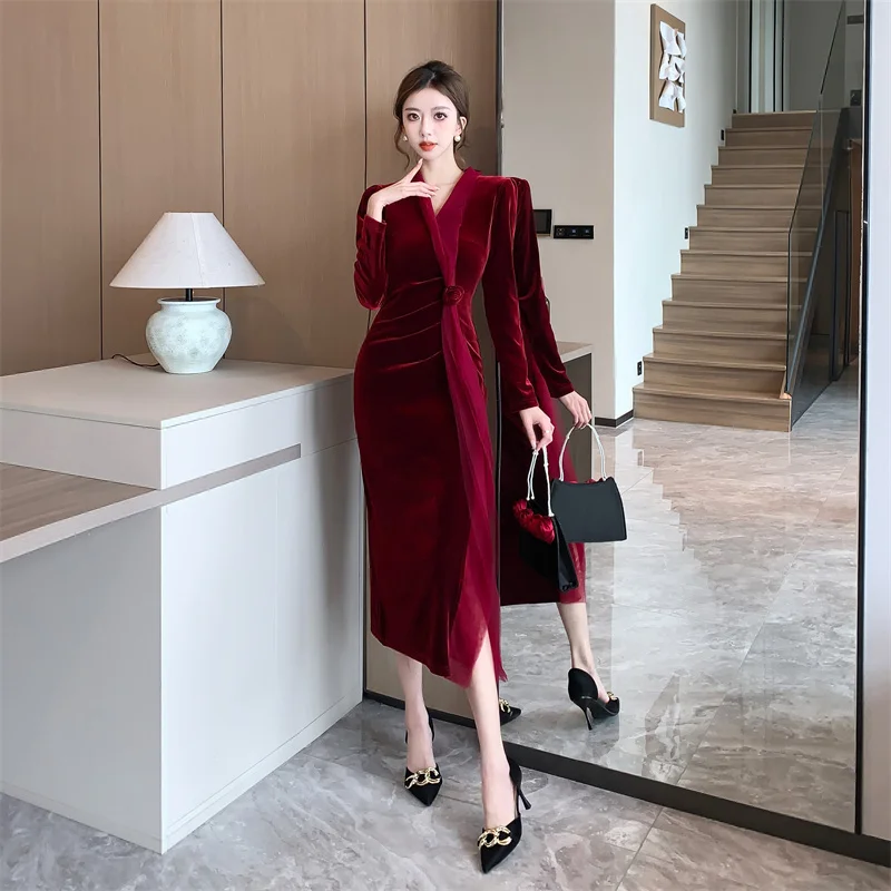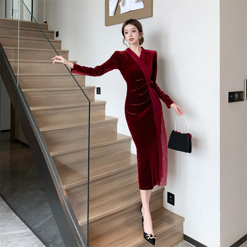 2024 Red Velvet Luxury Party Evening Dress Autumn Winter Fashion Patchwork Mesh Festival Dress Women Korean Vintage Dress Prom