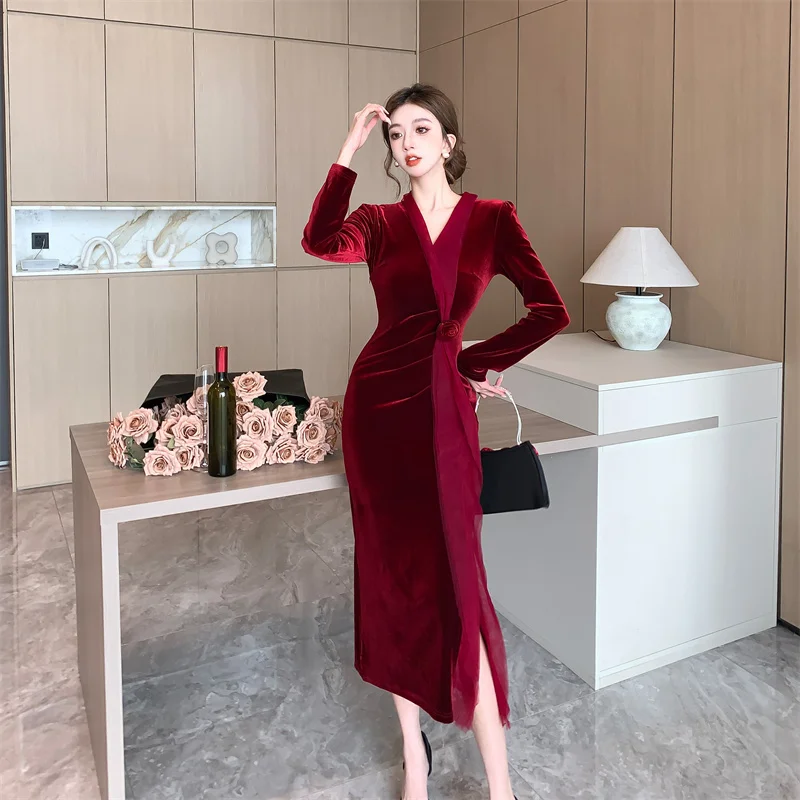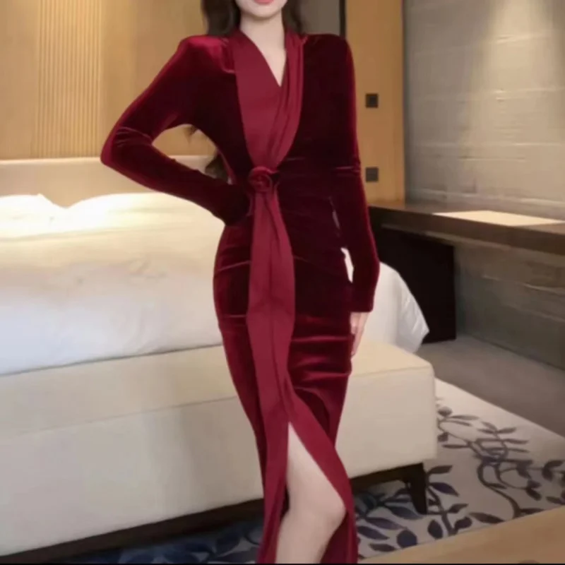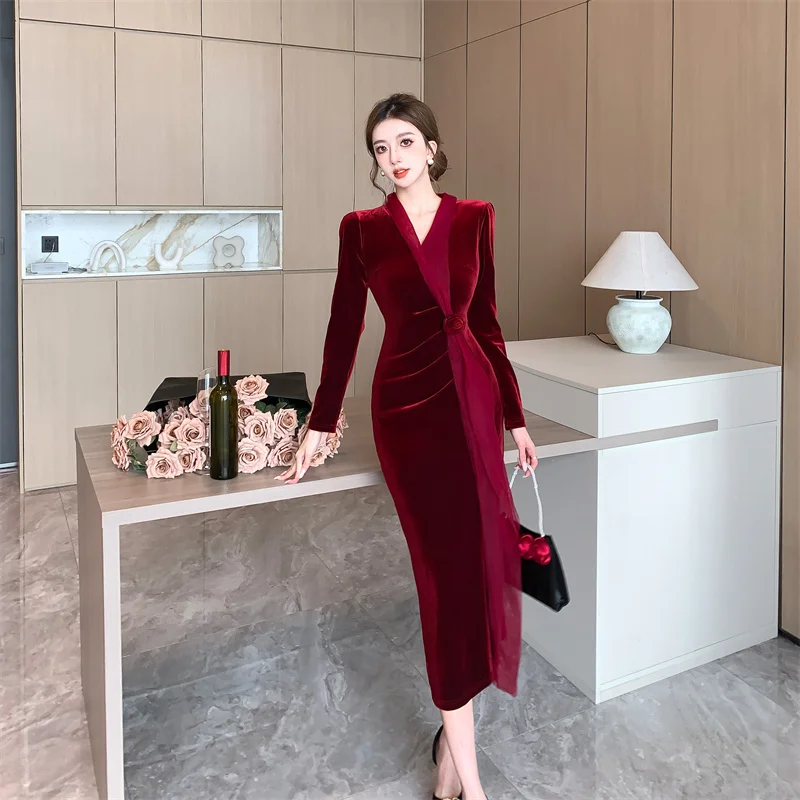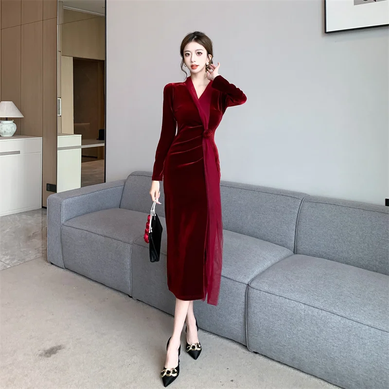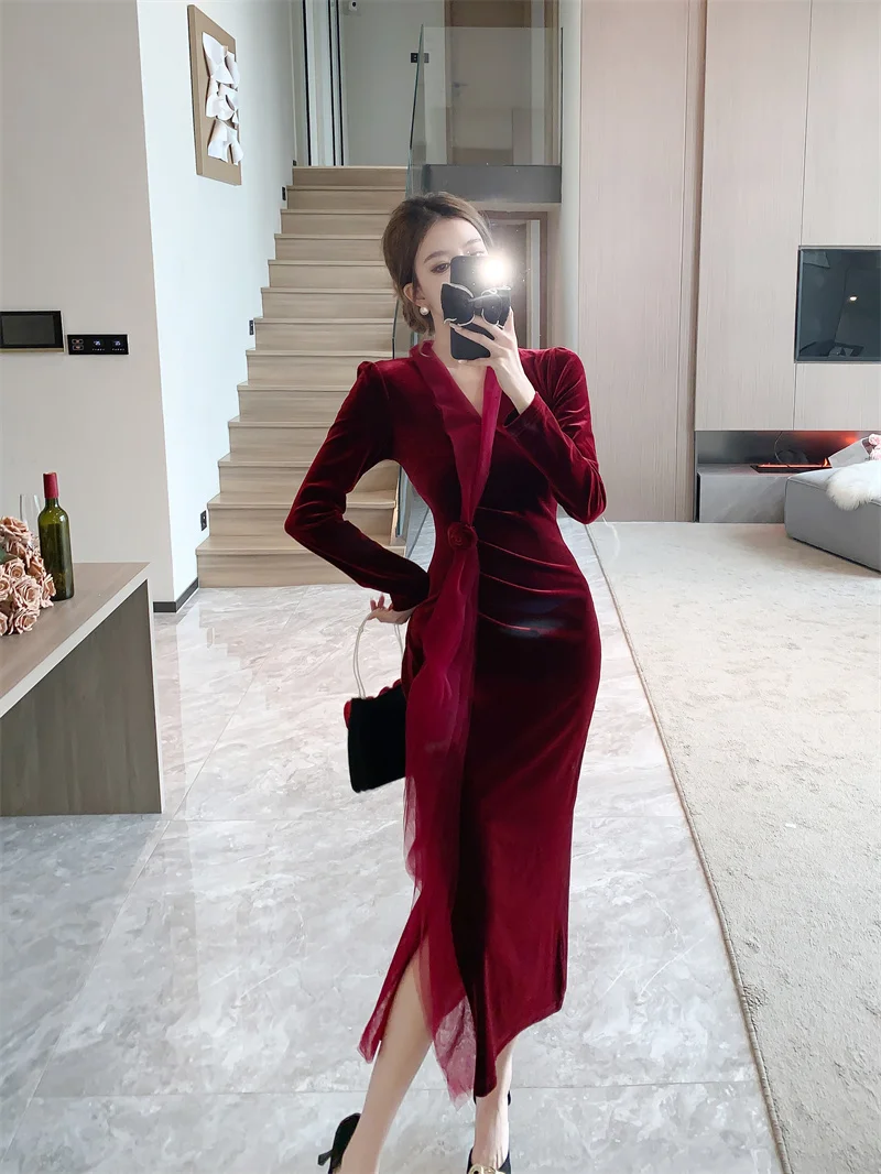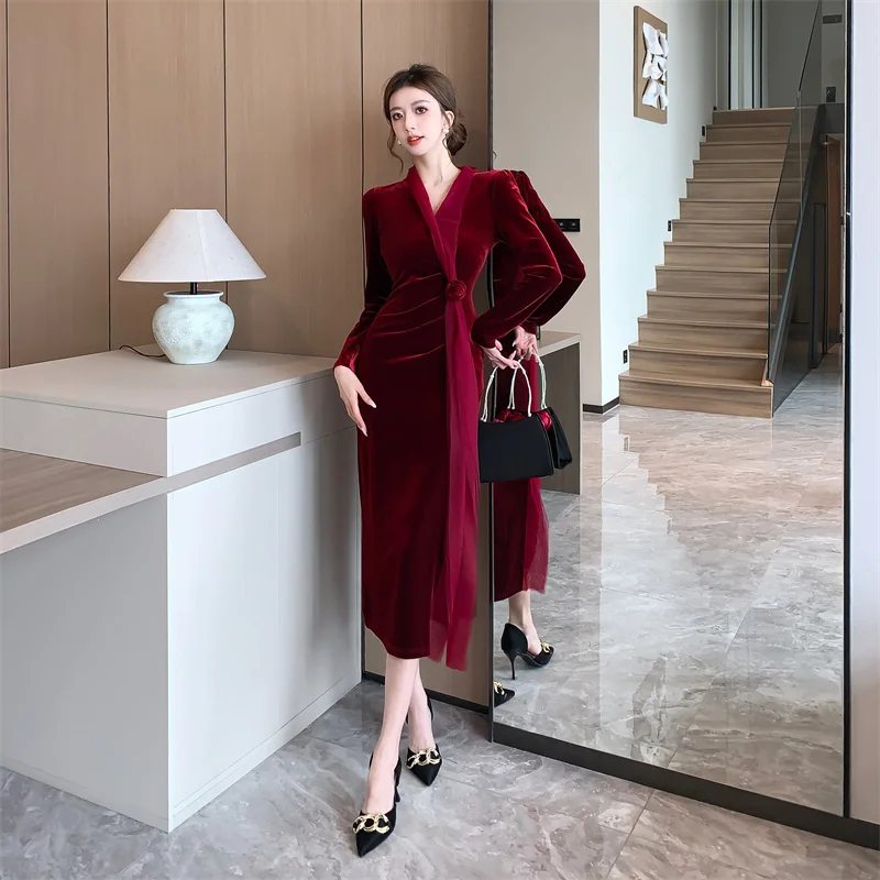 2024 Red Velvet Luxury Party Evening Dress Autumn Winter Fashion Patchwork Mesh Festival Dress Women Korean Vintage Dress Prom