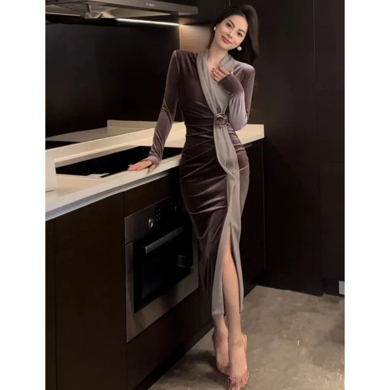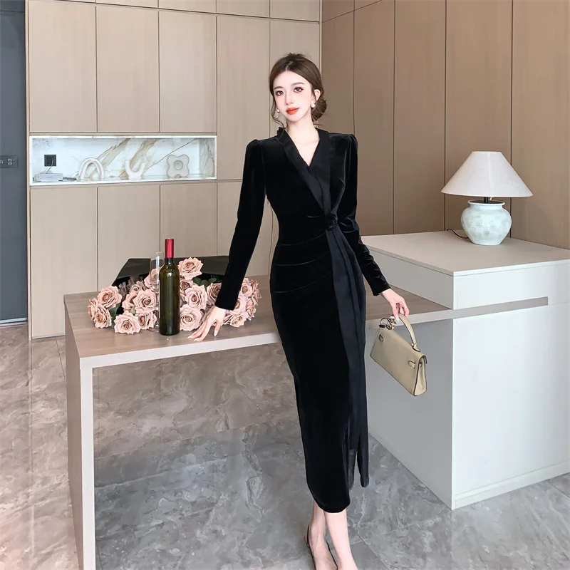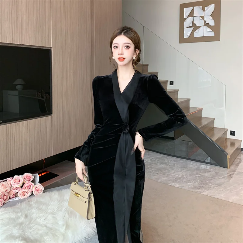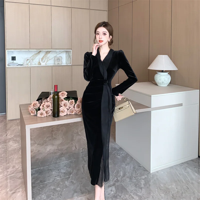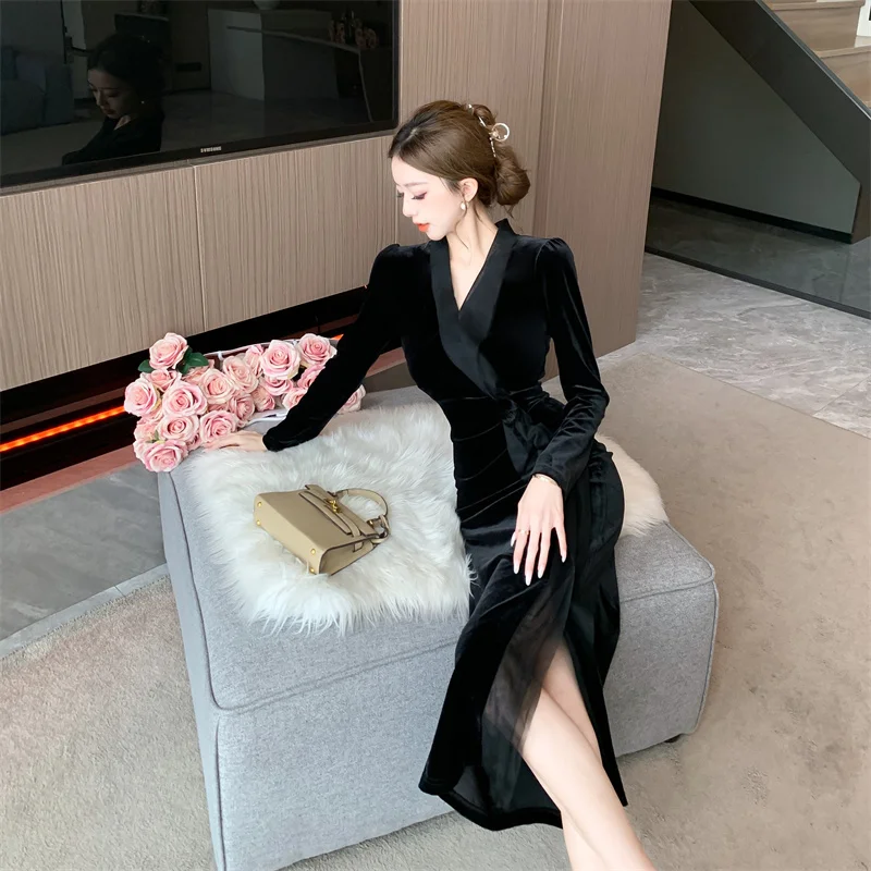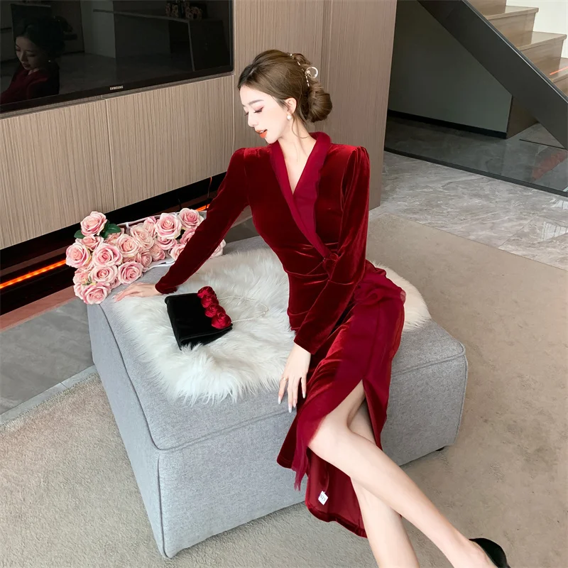 2024 Red Velvet Luxury Party Evening Dress Autumn Winter Fashion Patchwork Mesh Festival Dress Women Korean Vintage Dress Prom