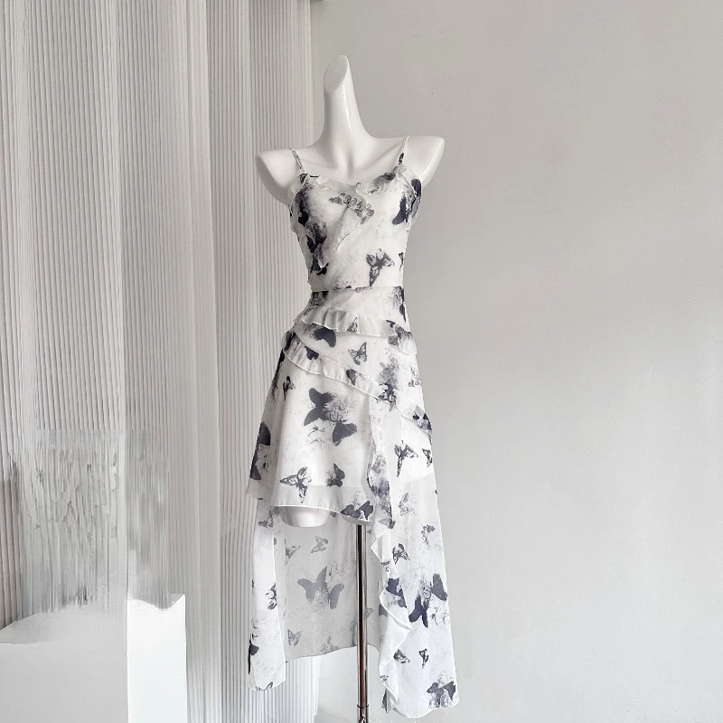 2024 Summer Chiffon Butterfly Midi Dress Suit Women Elegant Irregular Sleeveless Dress + Black Short Cardigan Korean Fashion Set
