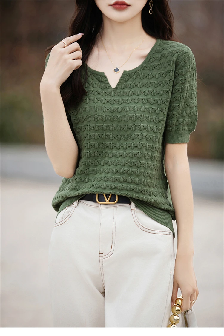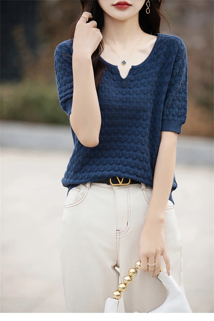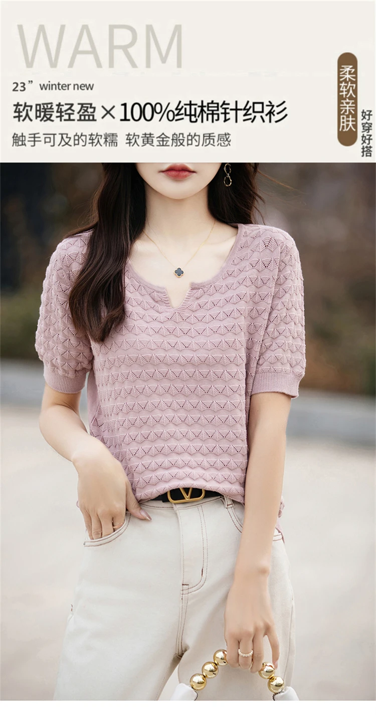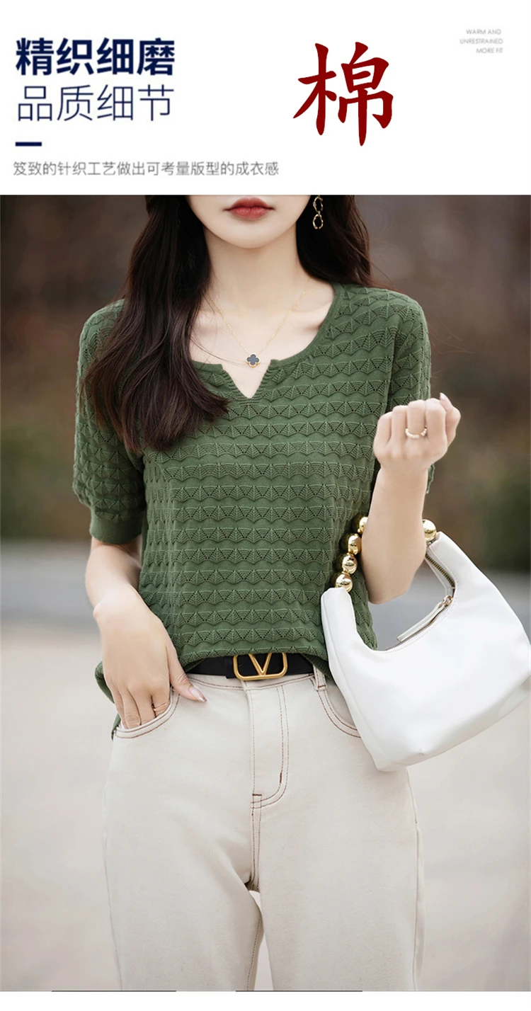 2024 Summer New Short sleeved Women’s V-neck Solid Color 100% Cotton Pullover T-shirt Knitted Loose Fashion Women’s Top T-shirt