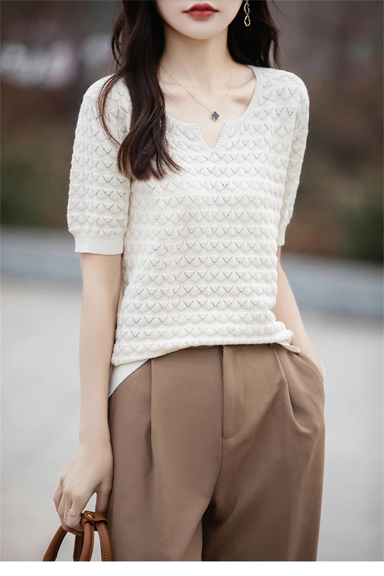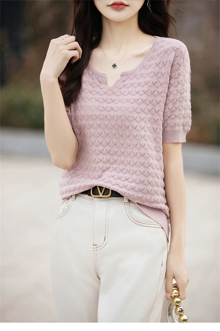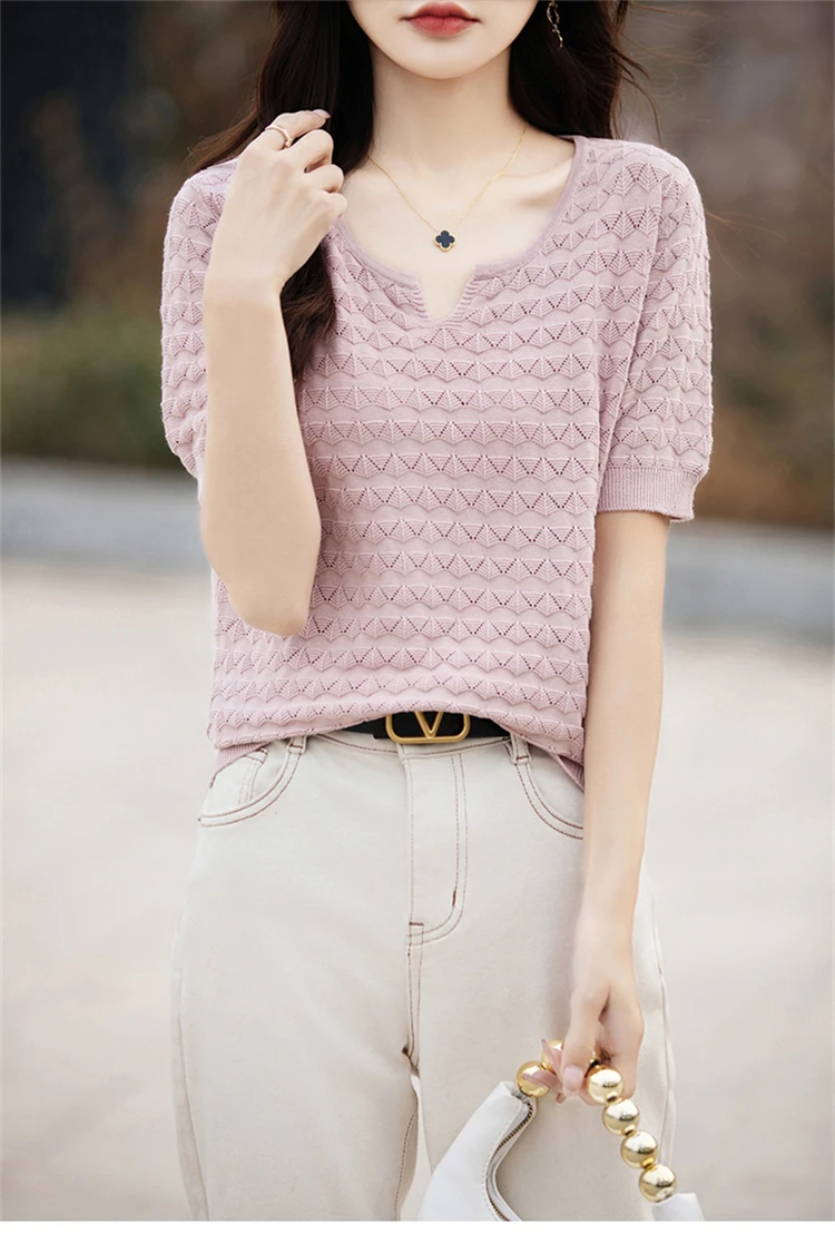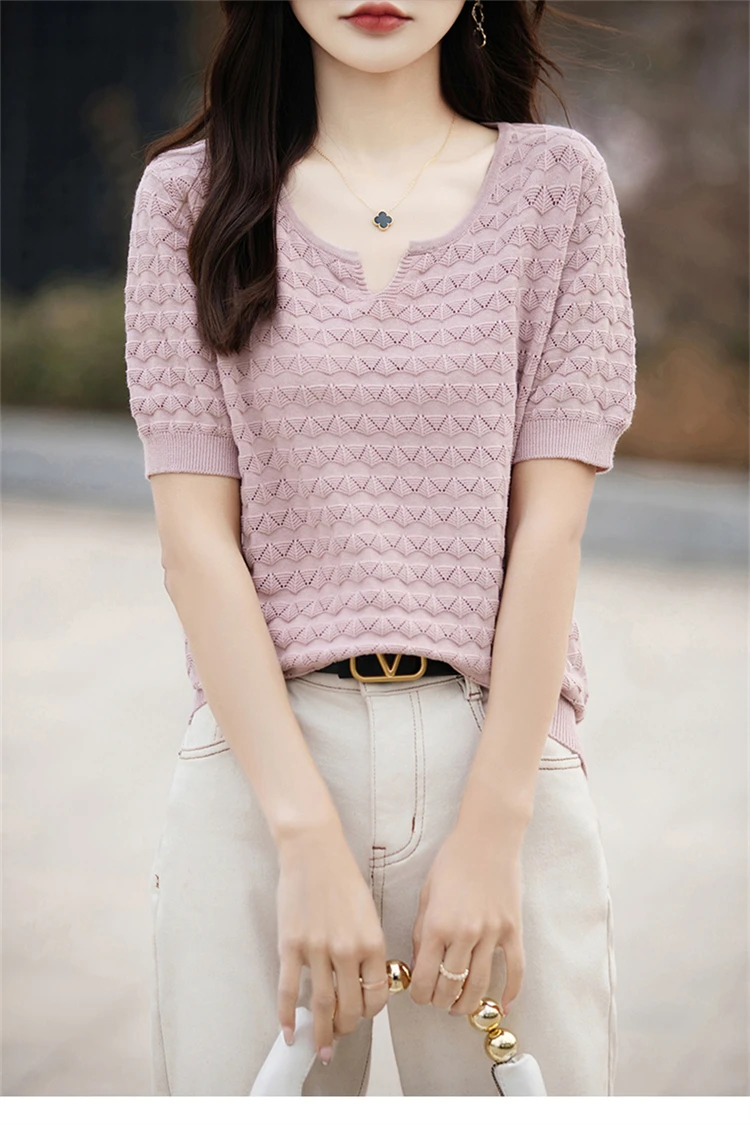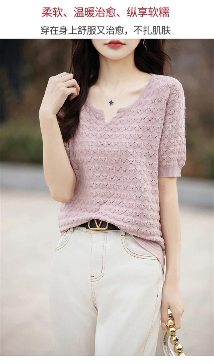 2024 Summer New Short sleeved Women’s V-neck Solid Color 100% Cotton Pullover T-shirt Knitted Loose Fashion Women’s Top T-shirt