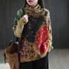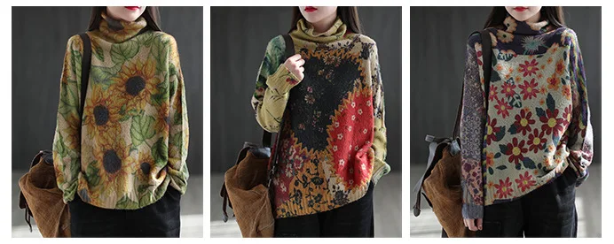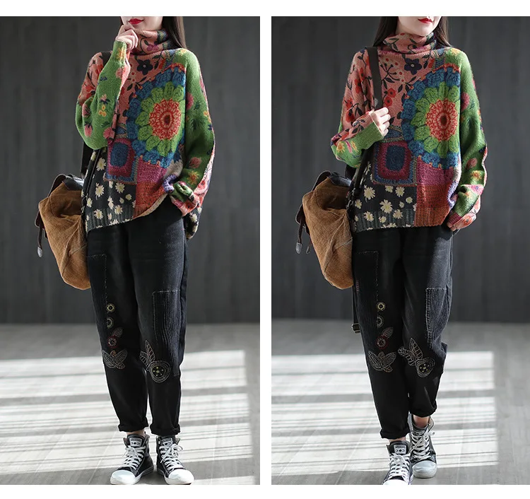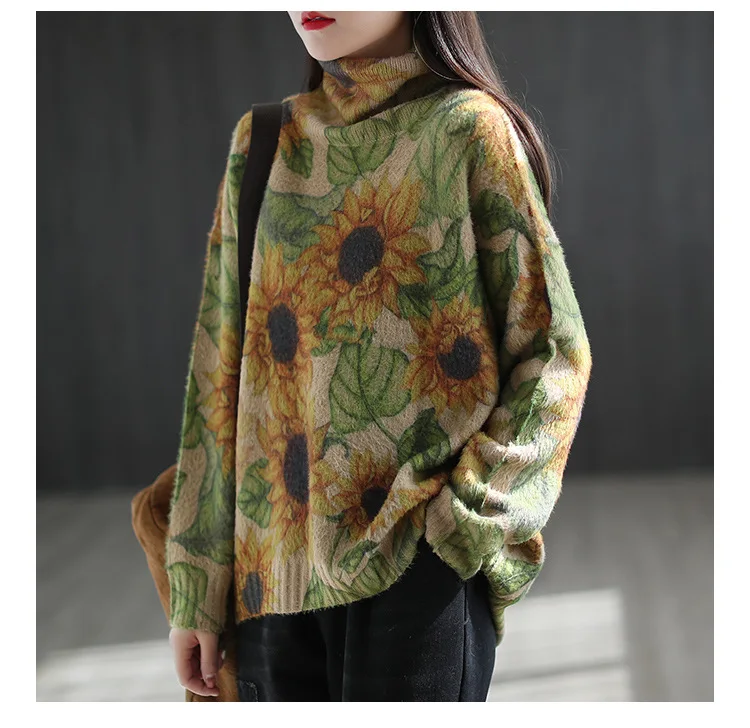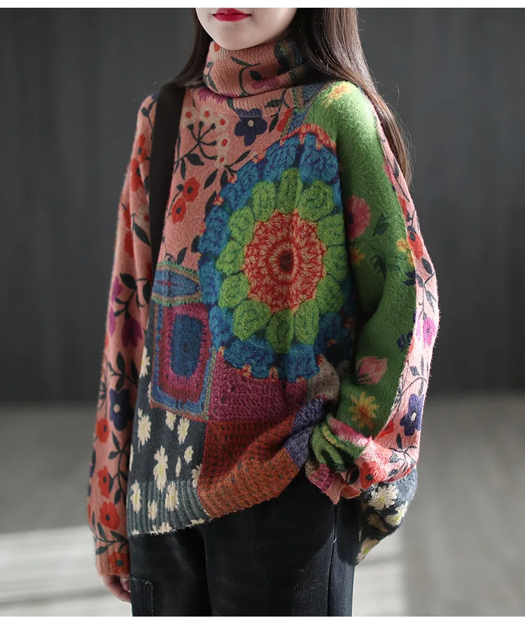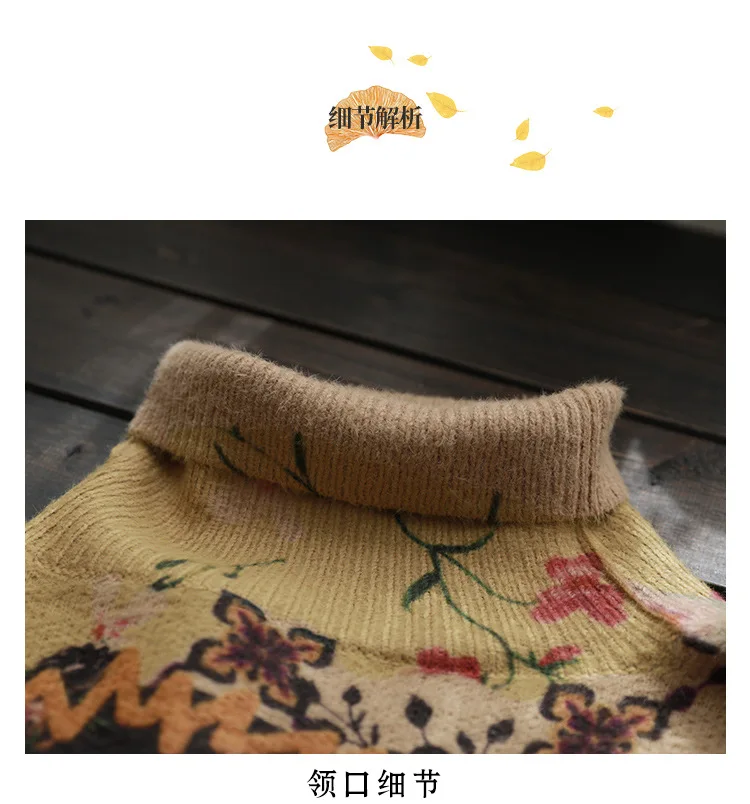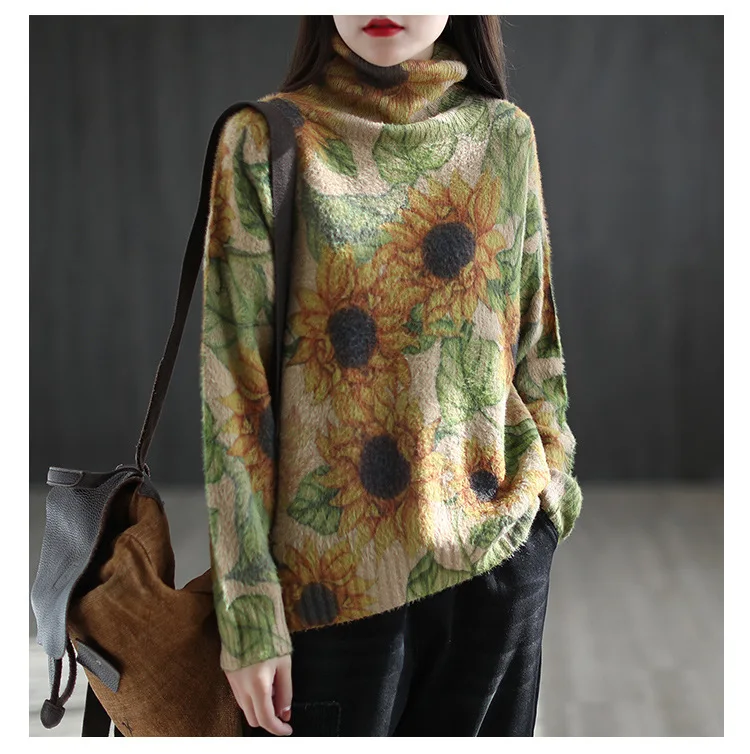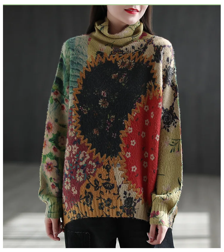 22New Women Imitation Mink Sweaters Autumn Winter Vintage Print Color TurtlenecK Collar Spliced Female Tide Knit Pullovers