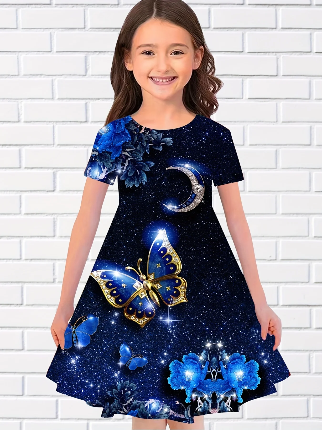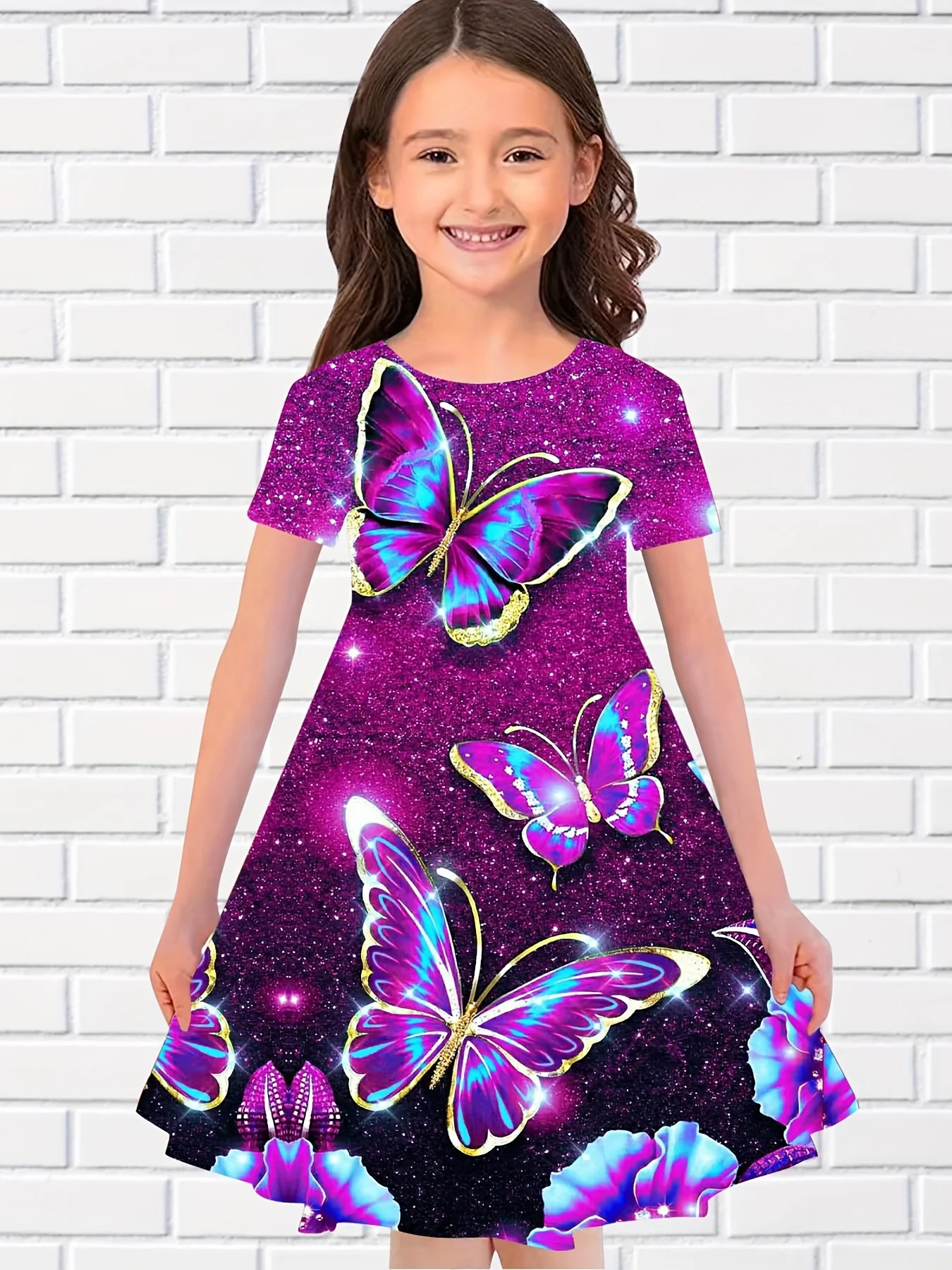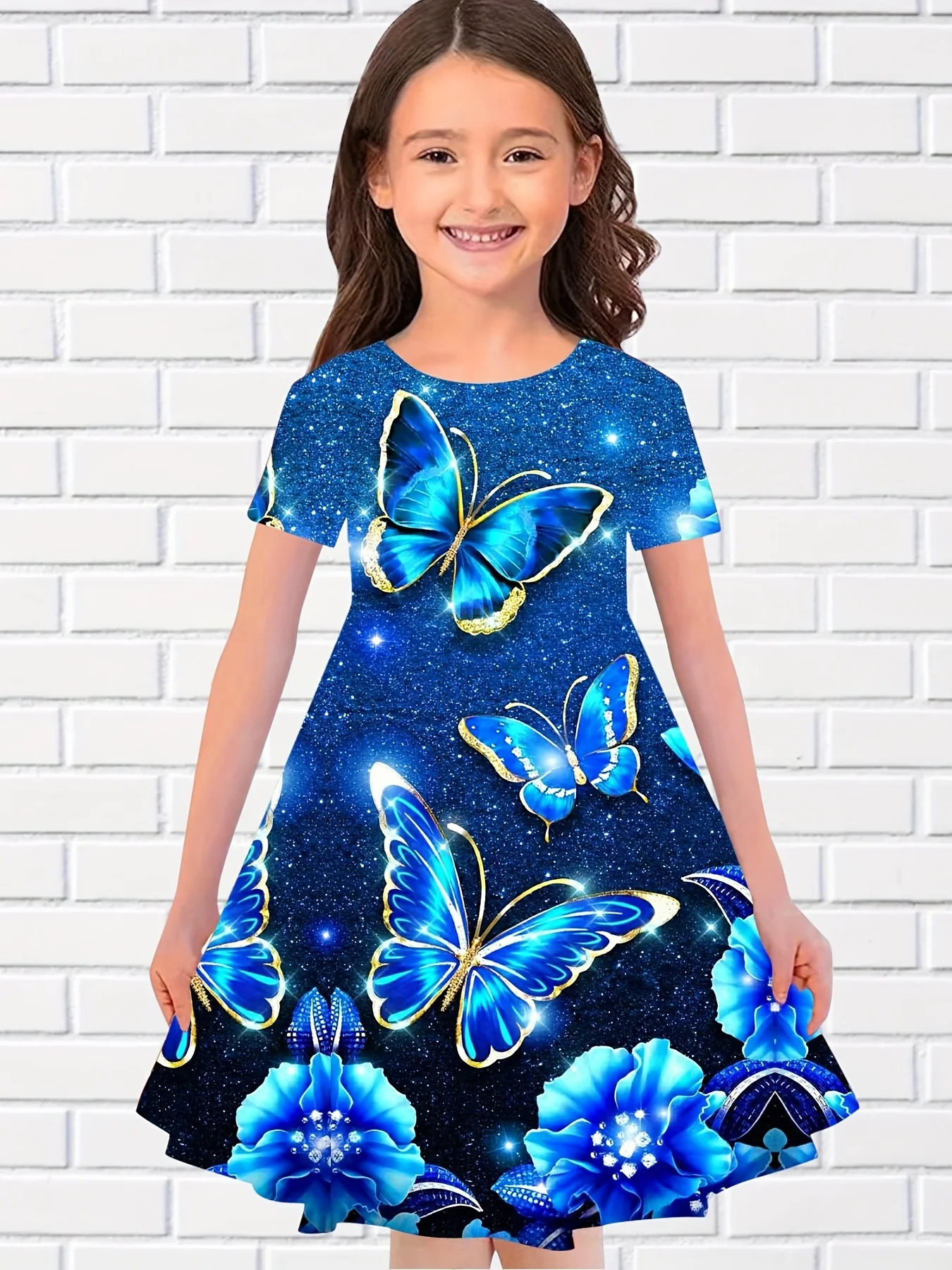 3-14 year old girl butterfly small fresh 3D printed short sleeved dress loose and comfortable party dress