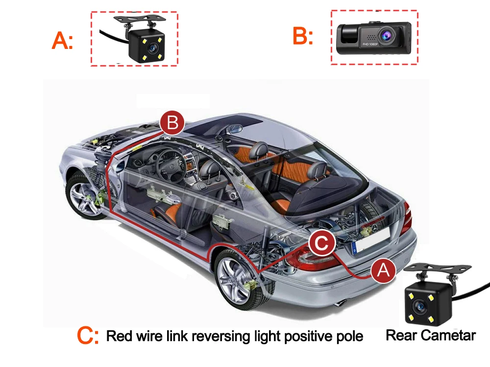 C:You need to link the red wire of the rear camera to the positive pole of the reversing light in order to realize the reversing image