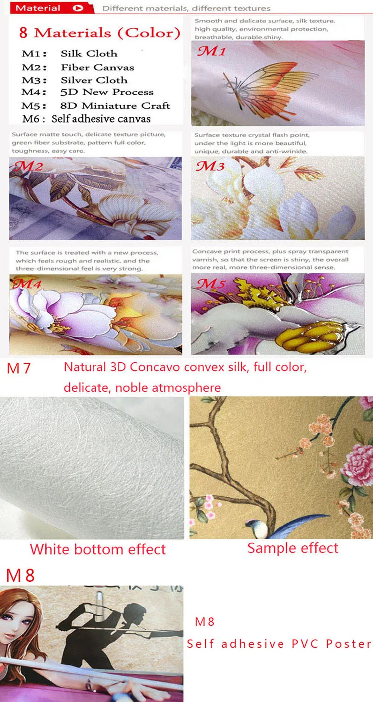 There are 8 material available to choose(8 Material available:Silk Cloth / Fiber Canvas / Silver Cloth/ Self adhesive PVC/ 5D New Process /Self Adhesive Canvas/8D Miniature Craft/Concavo convex silk).