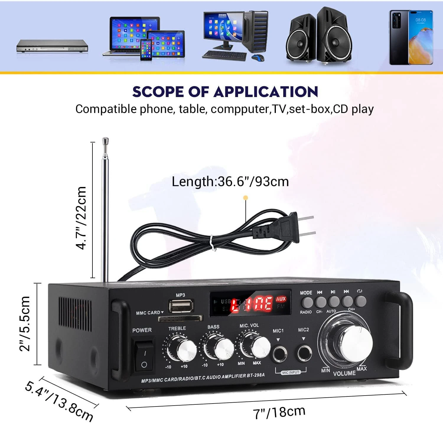 -TF Card, AUX, U disk, MP3 format play, support bluetooth wireless connection.