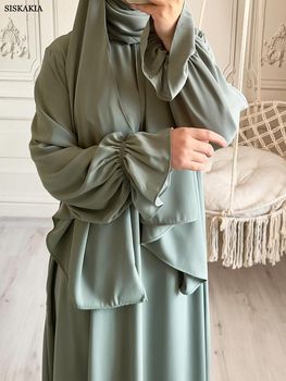 Siskakia Solid Modest Abaya Muslim Woman Dubai Dresses With Headscarf Flare Sleeve Casual Clothing Islam Dubai Prayer Robe
