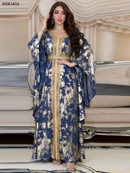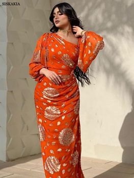 Siskakia Fashion Floral Gold Stamping Sexy Chiffon Dress Turkish Dubai Luxury Evening Party Elegant Puff Sleeve Gown