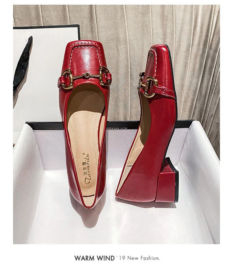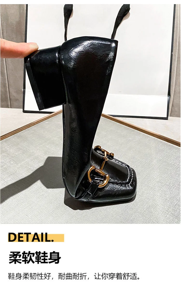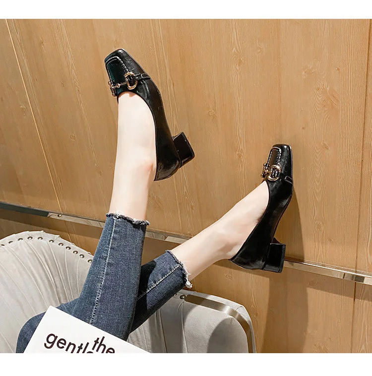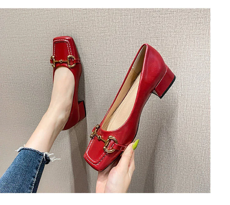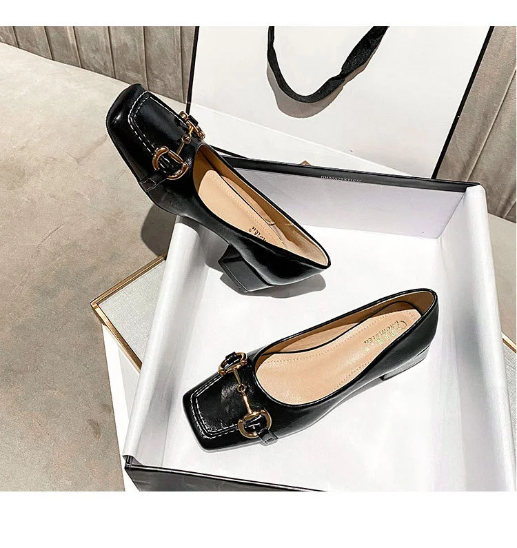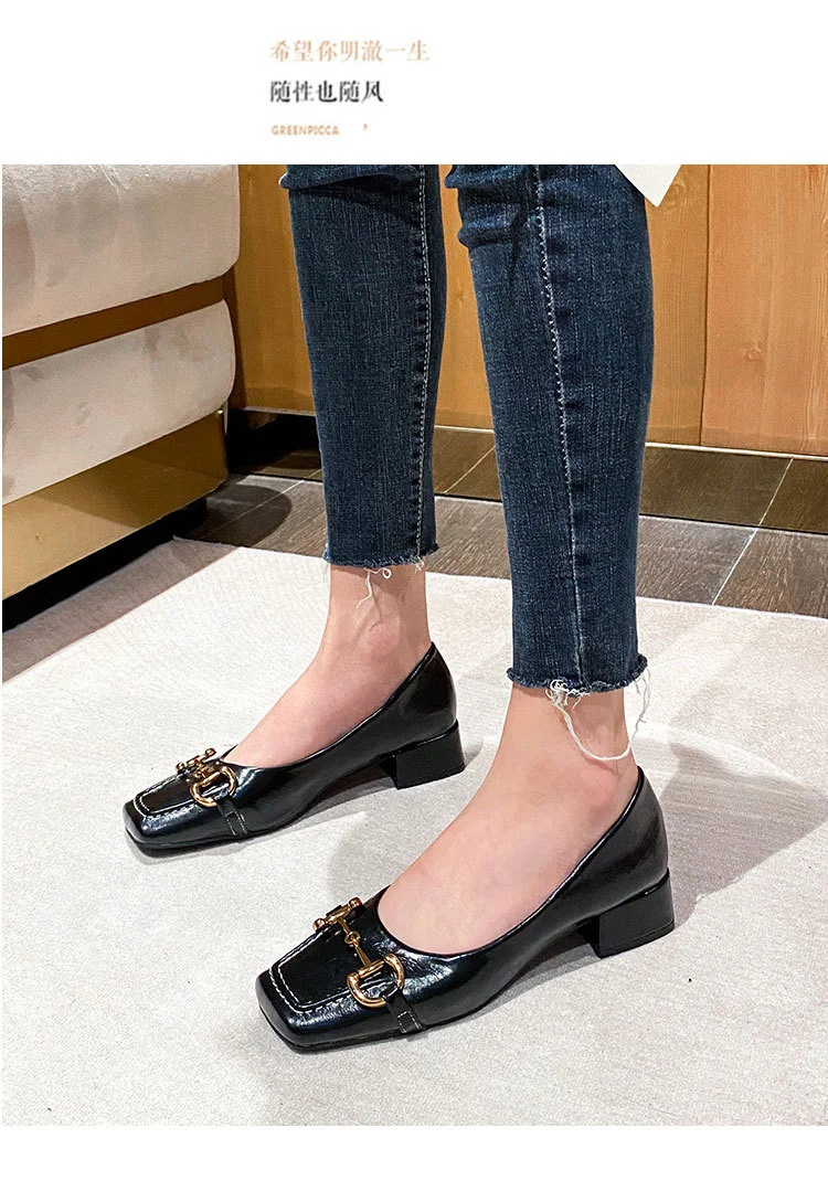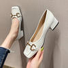 2022 New Style Single Shoes Fashion Thick Heel Square Toe Metal Shallow Mouth Mary Jane Women’s Shoes Large Size Women’s Shoes