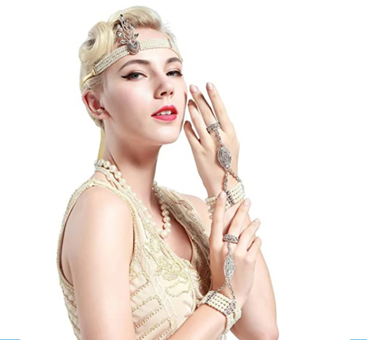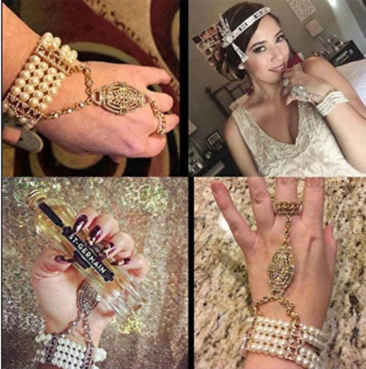 Art Deco The Great Gatsby Inspired Flower Simulated Pearl Bracelet Set Wedding Bridal Bracelet 1920s Flapper Accessories