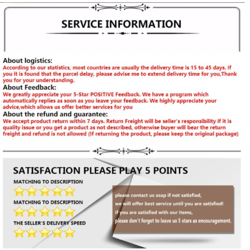 * يمكنك إرسال طلبات استرداد الأموال في غضون 15 يومًا بعد انتهاء فترة التسليم المضمونة (45 يومًا). يمكنك القيام بذلك عن طريق إرسال رسالة على صفحة تواصل معنا page