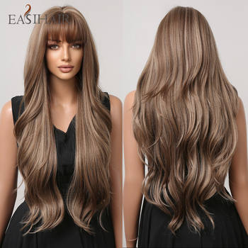 EASIHAIR Brown Mixed Blonde Synthetic Wigs with Bang Long Natural Wavy Hair Wig for Black Women Daily Cosplay Use Heat Resistant