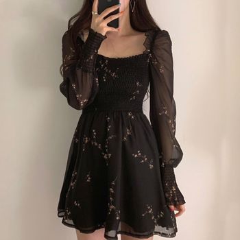 Women Sexy Black Chiffon Dress Spring Vintage Flower Long Puff Sleeve Dresses Korean Casual Mini Vestidos Elegant Clothes 13676