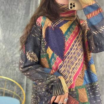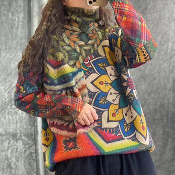 Turtleneck Imitation Mink Sweaters Woman Pullovers Flowers Printed Panelled Pattern Warm Loose Knitted Vintage Tops