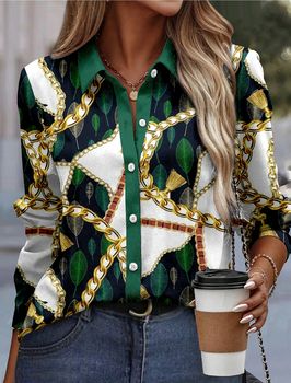 Women Fashion Wild Shirts Chain/Floral/Letter/Geometric Square Print Turn-Down Collar Long Sleeve Blouses