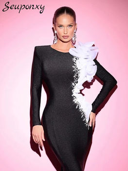 High Quality Women’S Bandage Dress Sexy O-Neck Long Sleeved Luxurious Diamond Crystal 3D Flower Elegant Party Runway Vestidos