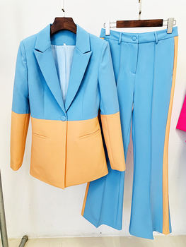 HIGH STREET Newest 2024 Designer Runway Suit Set Women’s Single Button Color Block Blazer Flare Pants Suit