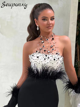 High Quality 2024 New Women’s Black Sexy Sleeveless Mesh Diamond Crystal Fashion Feather Bandage Dress Celebrity Party Dress