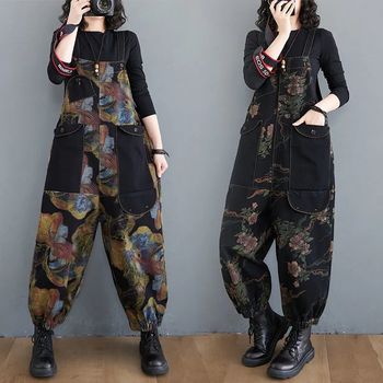 Women Loose Denim Jumpsuis Retro Women Shoulder Strap Harem Pants Casual Large Size Printed Jeans Overalls Wide-leg Rompers