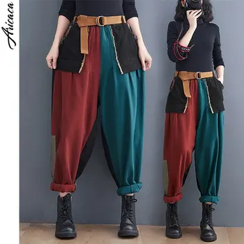 Aricaca Women Elastic Waist Loose Fashion splicing Casual Jeans M-2XL Denim Harem Pants
