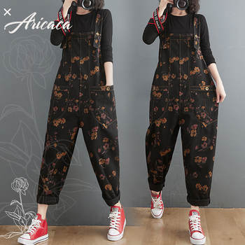 Aricaca Printed Loose Jeans Jumpsuit Women Casual Oversized Baggy Pants Big Pockets Denim Overalls
