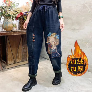 Retro Art 2024 Winter New Velvet Thickened Jeans Women’s Elastic High Waist Embroidered Loose and Slim Harlan Pants Pocket Jeans