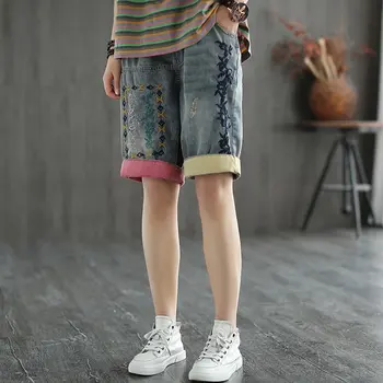 Summer Women Denim Shorts Female Vintage Flowers Embroidery Patch Shorts Woman Elastic Waist Loose Jeans Shorts