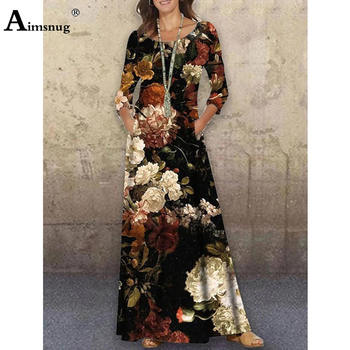 Aimsnug 2022 Autumn Bohemian Flower Print Dresses Women Long-sleeved Maxi Dress Oversized 3XL Ladies Vintage A-Line Dress Femme