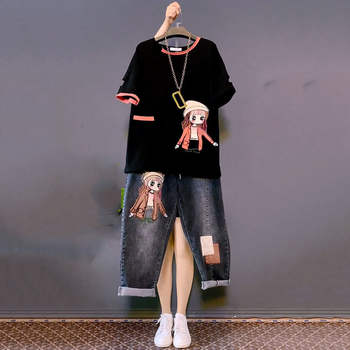 Women’s Summer Suits Women’s Jeans T-Shirt 2022 New Cartoon Tops Temperament Design Sense Straight Pants Two-Piece Set Female