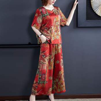 Women’s Suit Retro Imitation Ice Silk Printing Plus Size Clothing 2022 Summer New Fashion Loose Top Wide Leg Pants Two Piece Set