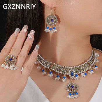 Vintage Pearl Jewelry Sets for Women Accessories Prom Rhinestone Antique Gold Color Necklace and Earrings Rings Set Party Gift