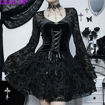 Y2K Sexy Lace Flared Long Sleeve Bandage Bodycon Party Dresses Elegant Vintage Aesthetic Black Velvet Mini Dresses Women Autumn