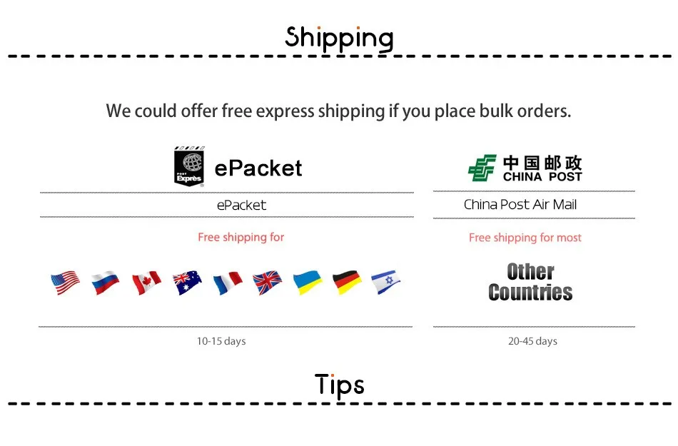 Packages from our warehouse in China will be shipped by ePacket or EMS depending on the weight and size of the product. Packages shipped from our US warehouse are shipped through USPS.