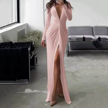 Summer New Women’s V-neck Long Sleeved Dress Loose and Sexy Party Pleated Dress