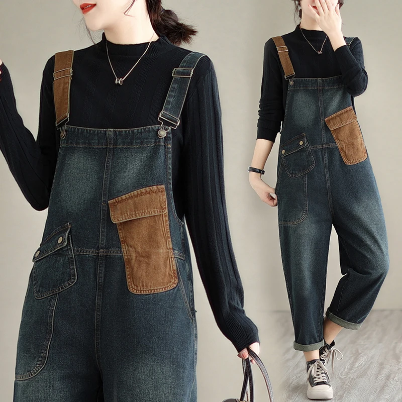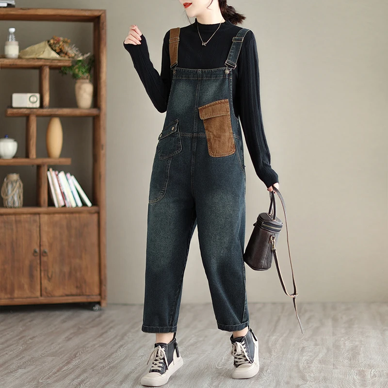 Aricaca M-2XL Fashion Denim Jumpsuits Women Vintage Loose Patchwork Color Denim Overalls