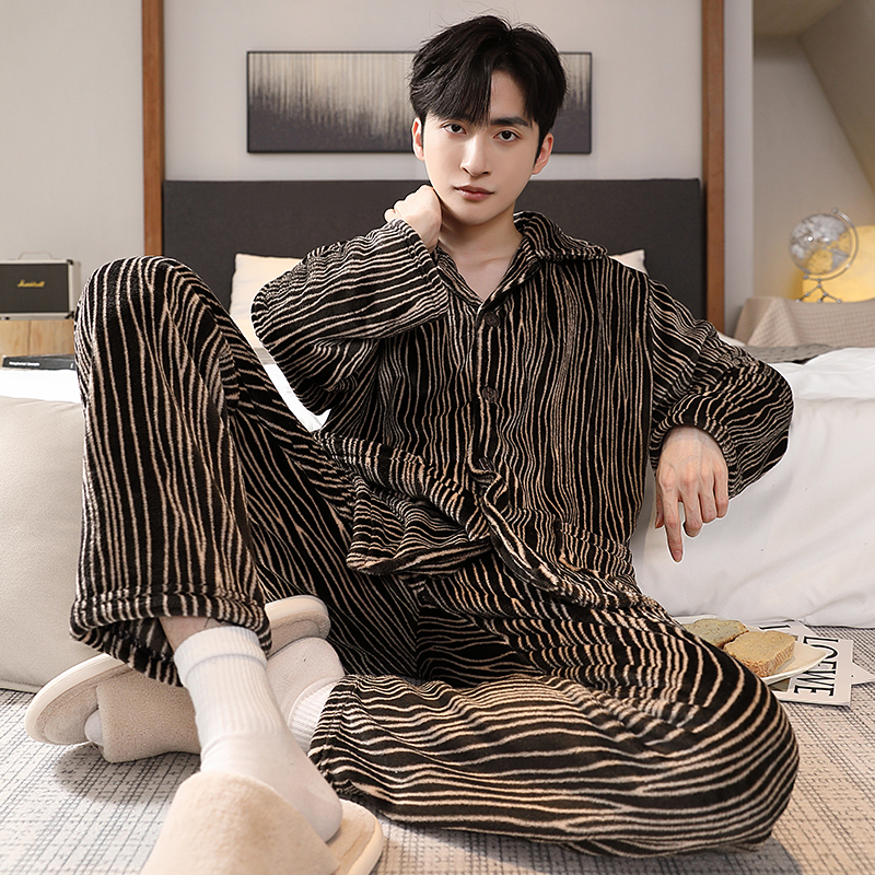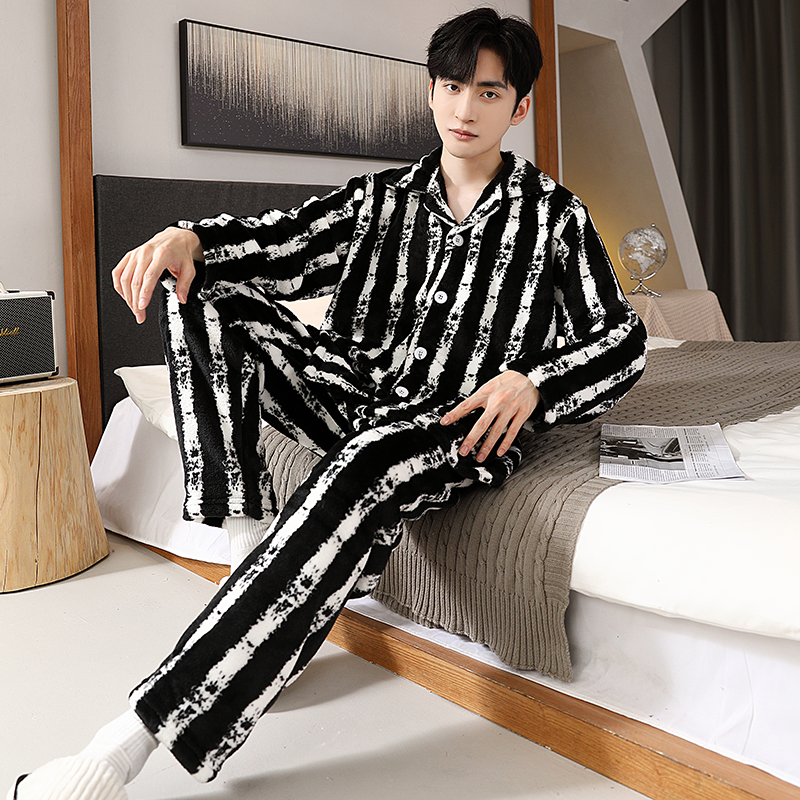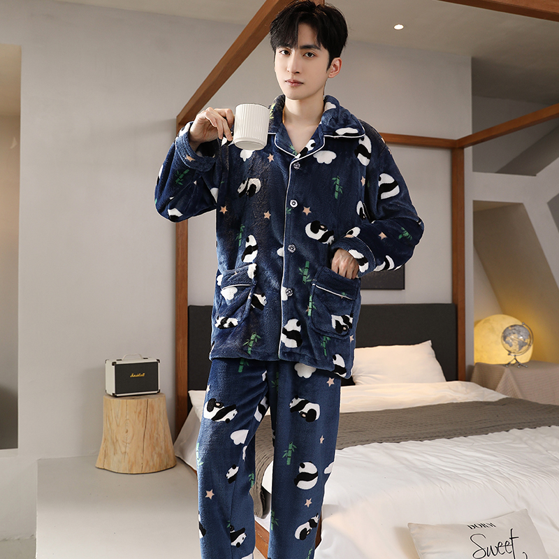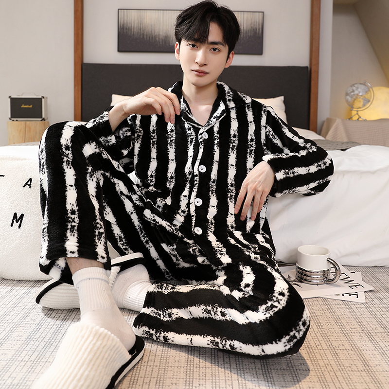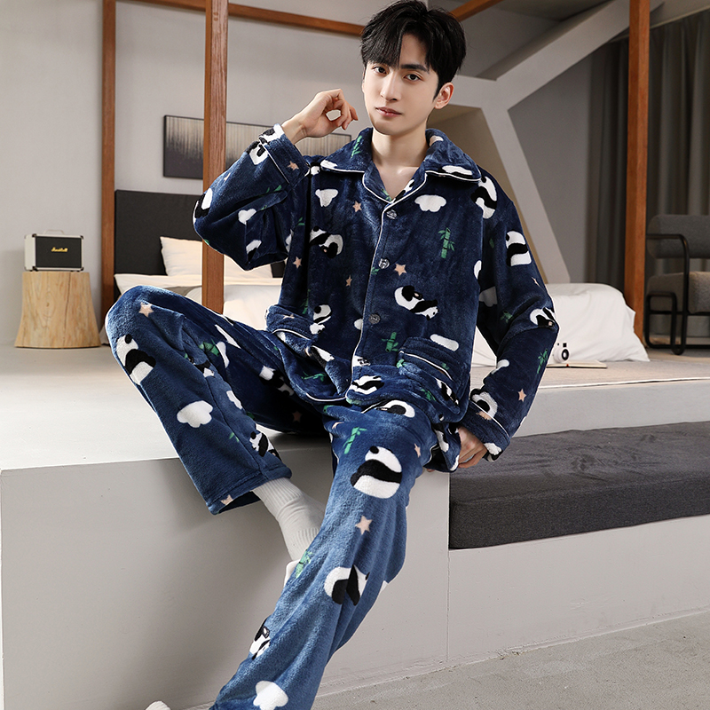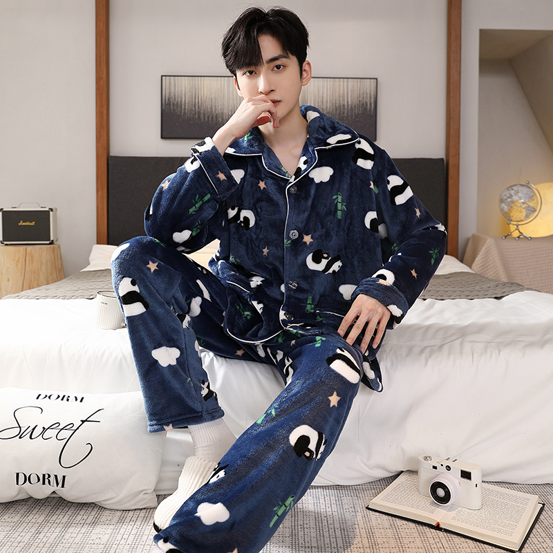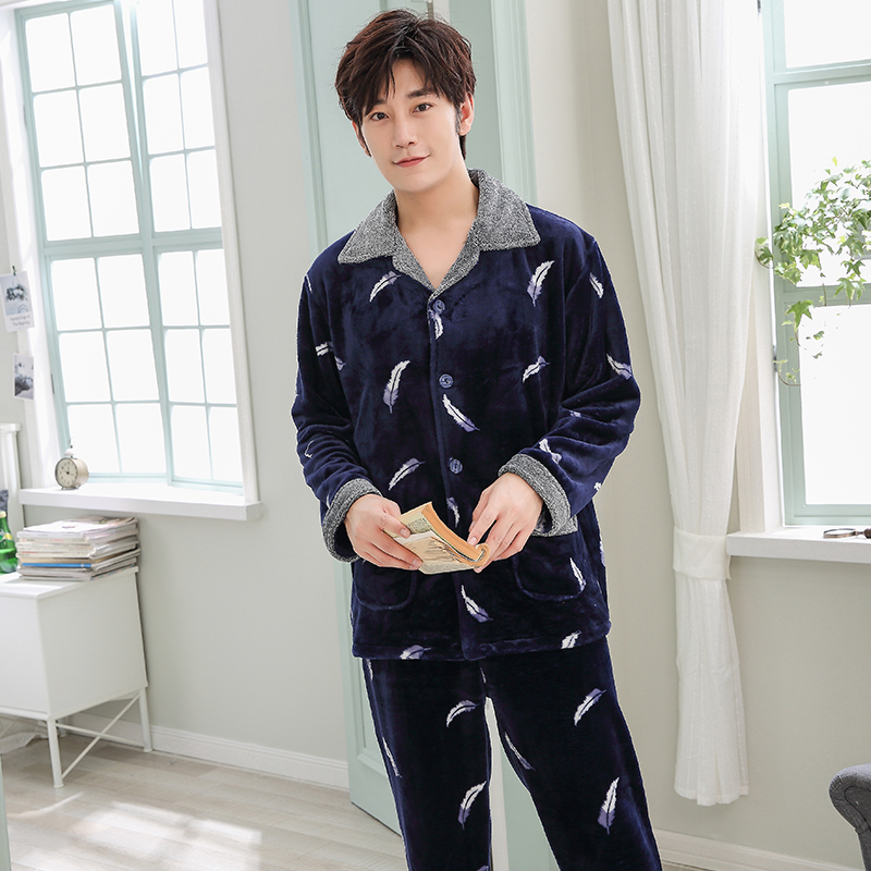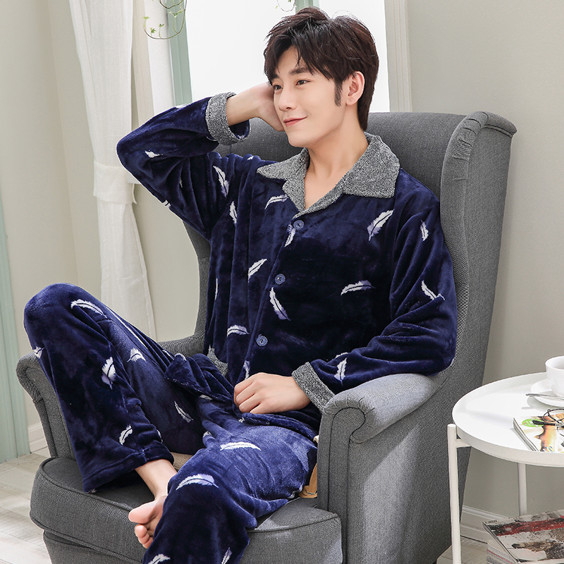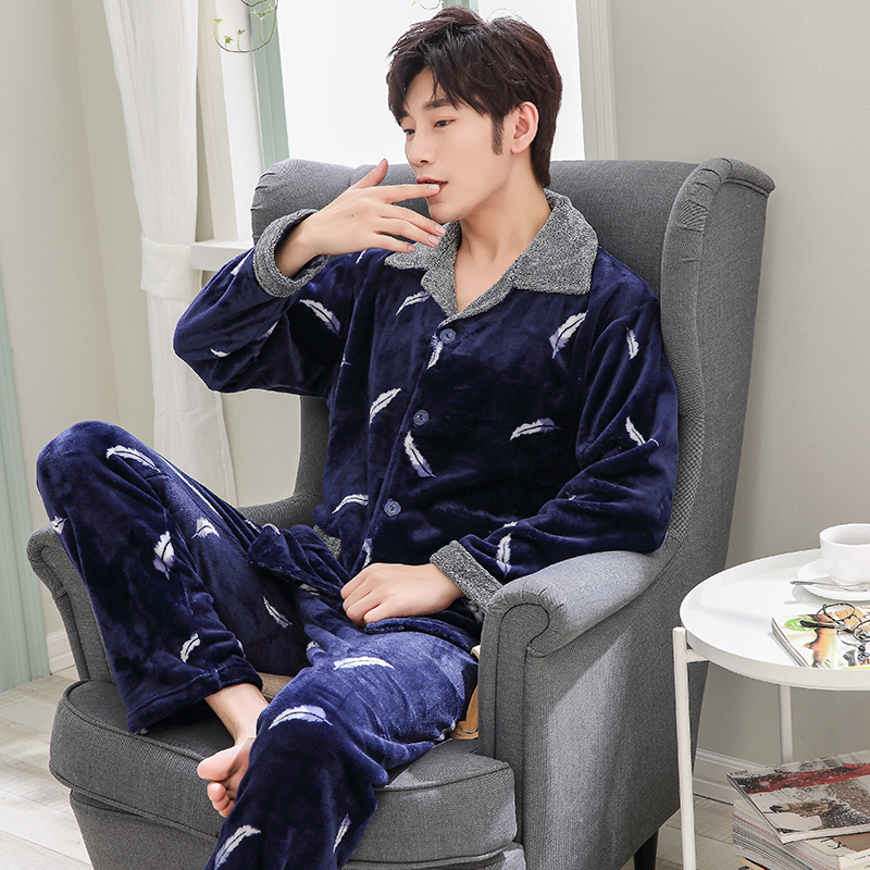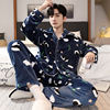 Autumn Winter Men’s Print Long Sleeve Pajamas For Wan Pyjama Flannel Thickened Warm Sleepwear Home Suit Button Pijama Loungewear