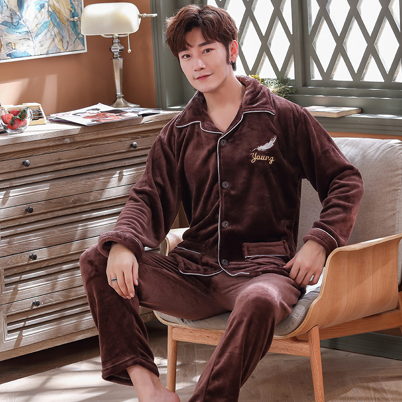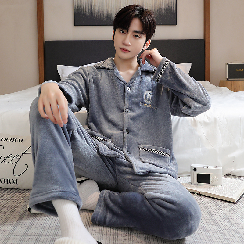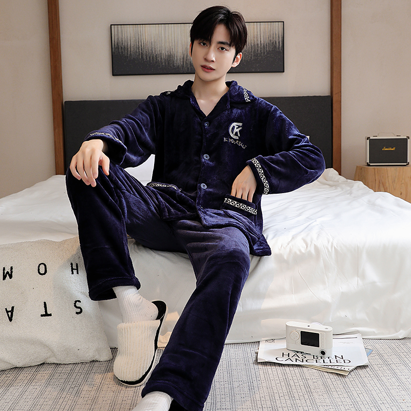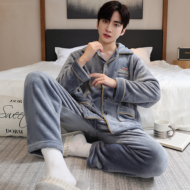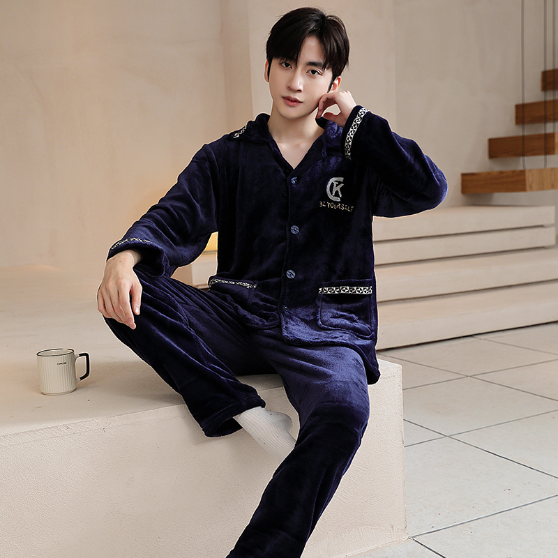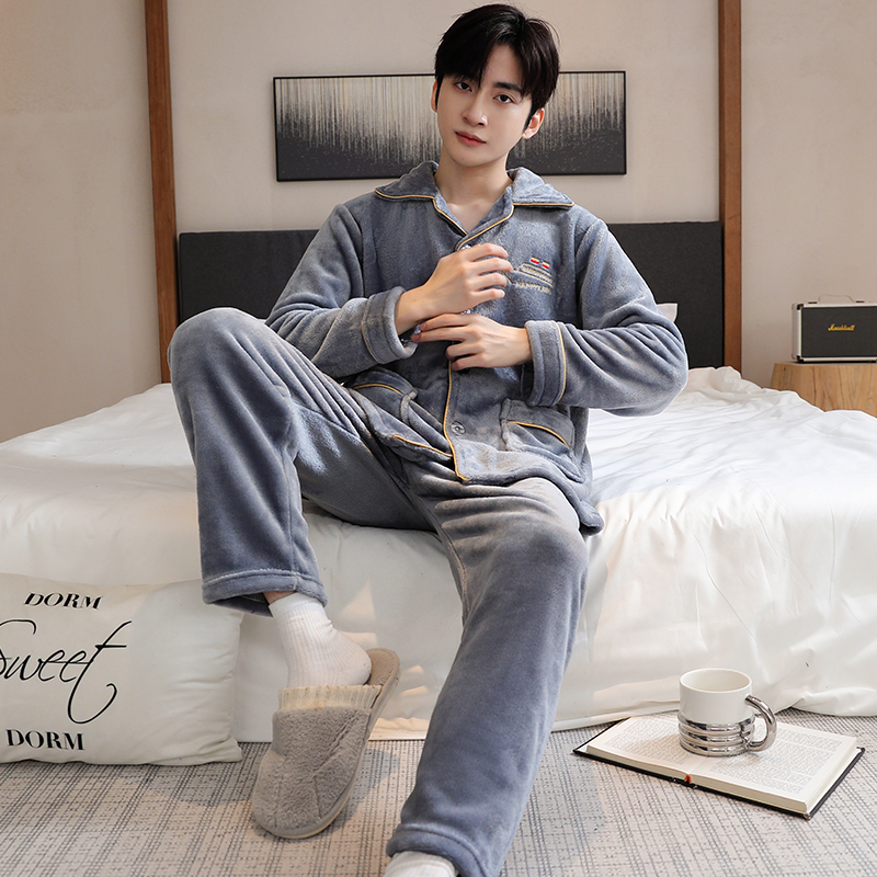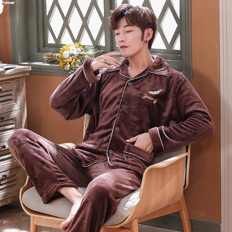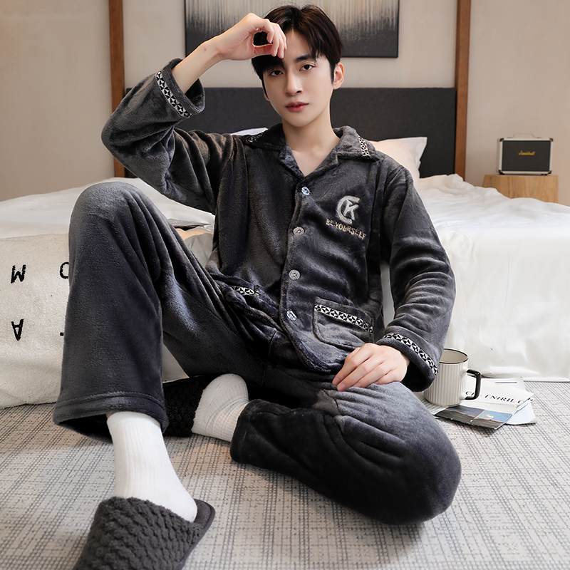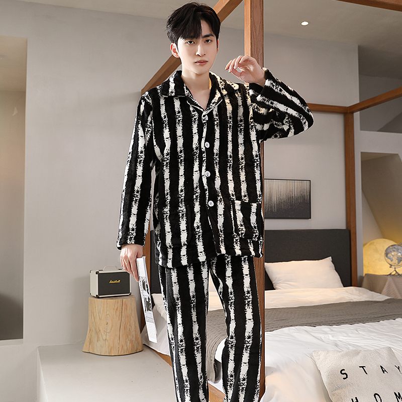 Autumn Winter Men’s Print Long Sleeve Pajamas For Wan Pyjama Flannel Thickened Warm Sleepwear Home Suit Button Pijama Loungewear
