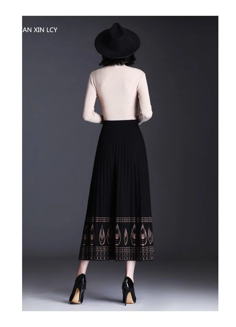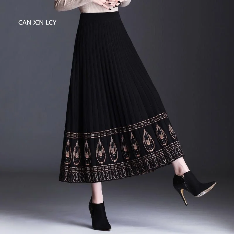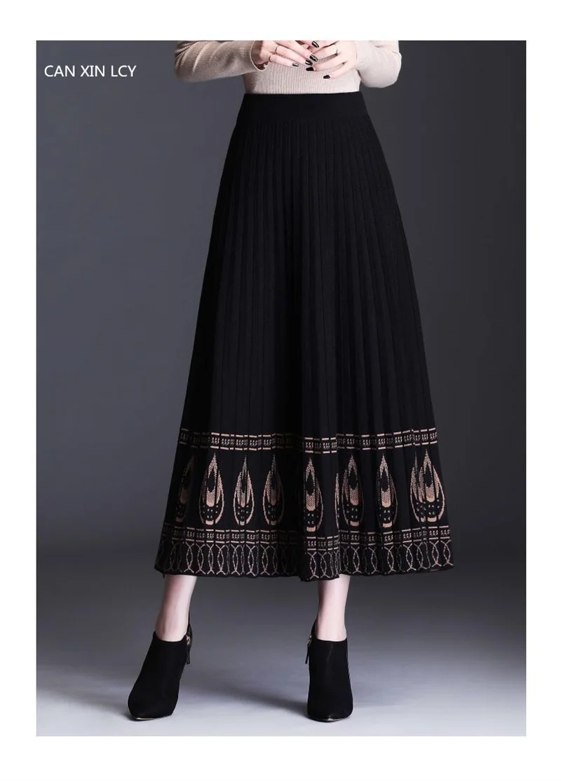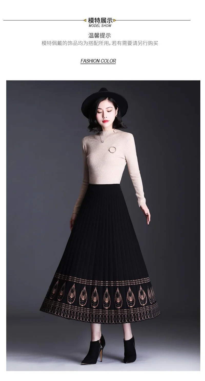 Autumn Winter New Thicken Knitted Skirt Women Fashion High Waist Long Warm A-Line Skirts Ladies Ethnic Style Pleats Knit Skirts